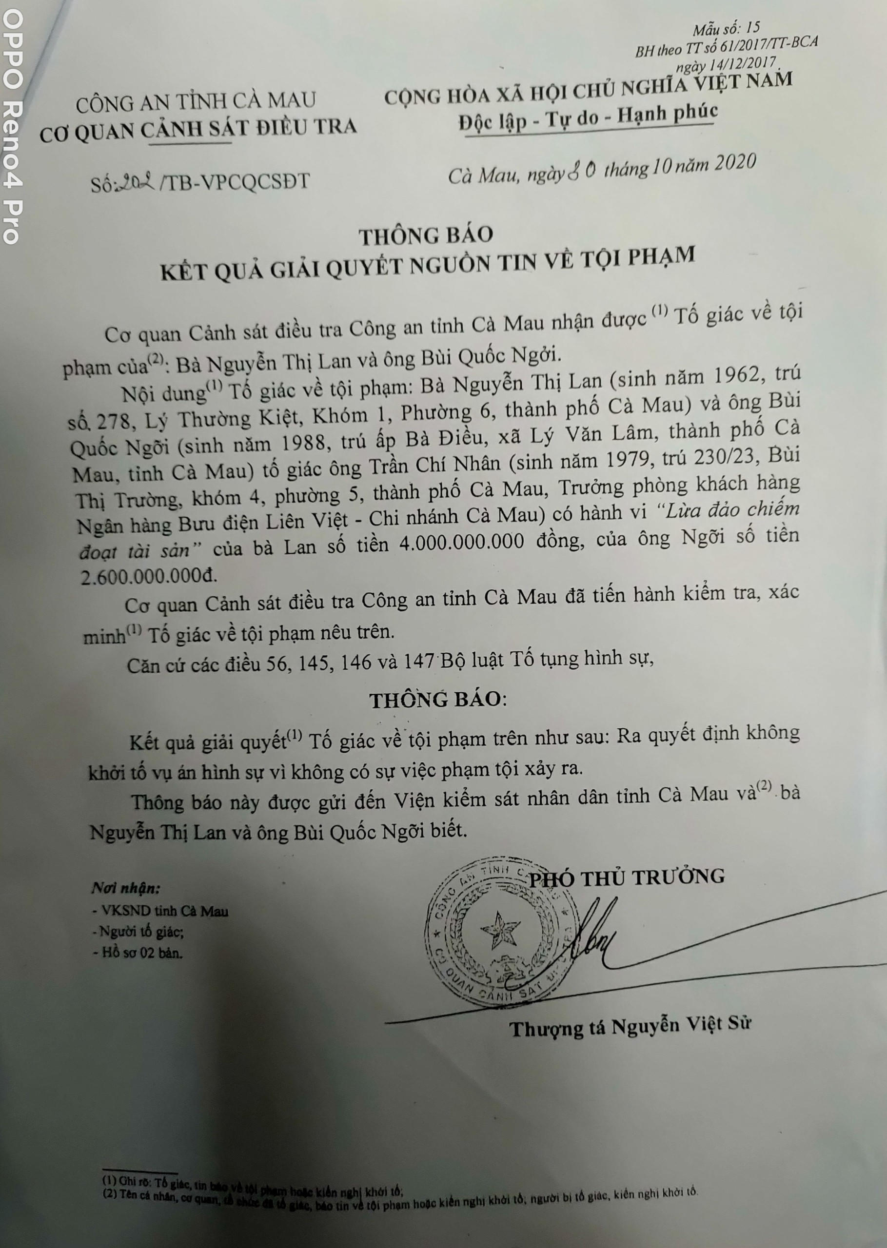 Ngày 30/10/2020, Cơ quan cảnh sát điều tra Công an tỉnh Cà Mau đã ra Thông báo số 202 về việc không khởi tố tố vụ án hình sự vì không có sự việc phạm tội đối với đơn tố cáo của Nguyễn Thị Lan và Bùi Quốc Ngỡi; riêng đơn tố cáo của ông Nguyễn Sĩ Quang thì vẫn còn đang xem xét.