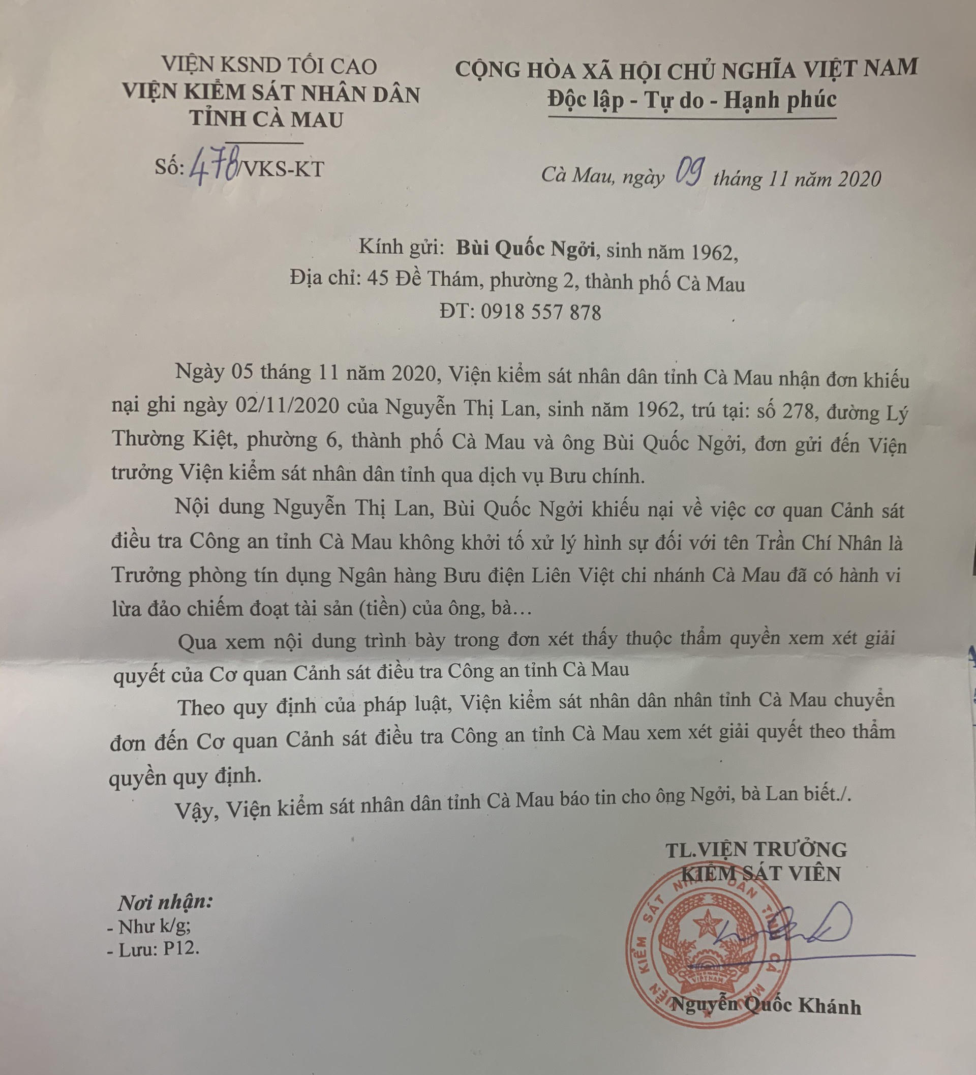 Đó là nội dung đơn khiếu nại và đơn "kêu cứu" các công dân Nguyễn Thị Lan (địa chỉ phường 6, TP Cà Mau); Bùi Quốc Ngỡi (ở xã Lý Văn Lâm, TP Cà Mau) và Nguyễn Sỹ Quang (ở phường 5, TP Cà Mau, tỉnh Cà Mau) gửi đến Báo Pháp luật Việt Nam cùng phản ánh việc họ bị ông Trần Chí Nhân (địa chỉ 230/23, đường Quang Trung, khóm 4, phường 5, TP Cà Mau, tỉnh Cà Mau) trong thời gian là Trưởng phòng khách hàng – Ngân hàng Liên Việt, chi nhánh Cà Mau đã có hành vi gian dối khi đưa ra lý do cần gấp tiền để đáo nợ ngân hàng nên vay của ba công dân trên gần 9 tỷ đồng, hẹn sau một tuần sẽ trả cả gốc lẫn lãi.