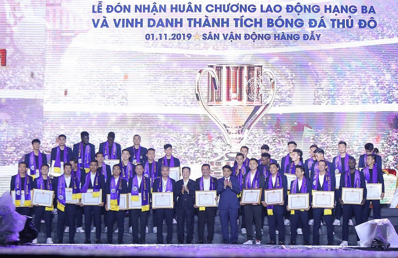 (PLVN) - Tối 1/11/2019, Hà Nội FC đã có buổi tri ân với người hâm mộ tại sân vận động Hàng Đẫy sau khi vô địch Cúp Quốc gia và V-League 2019. Đội bóng này cũng vinh dự được đón nhận Huân chương lao động hàng Ba.