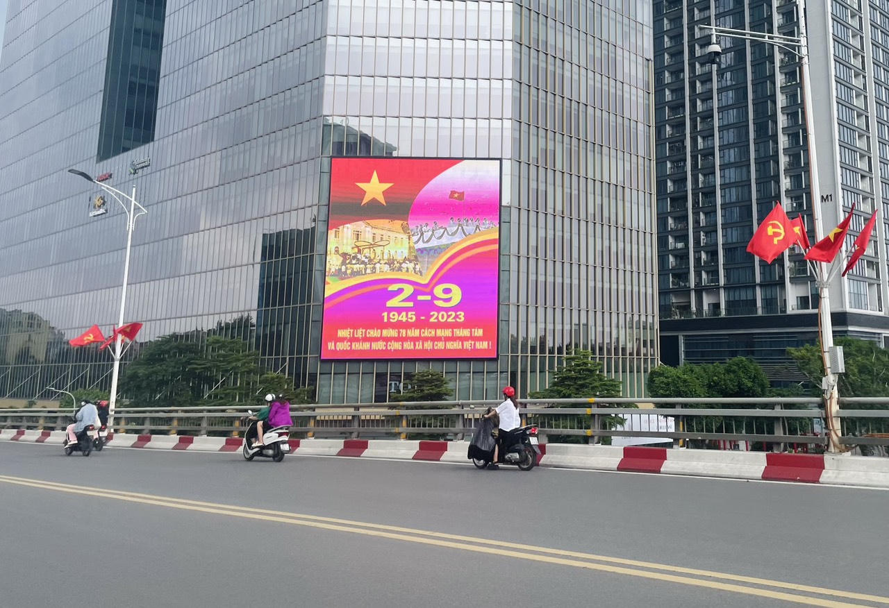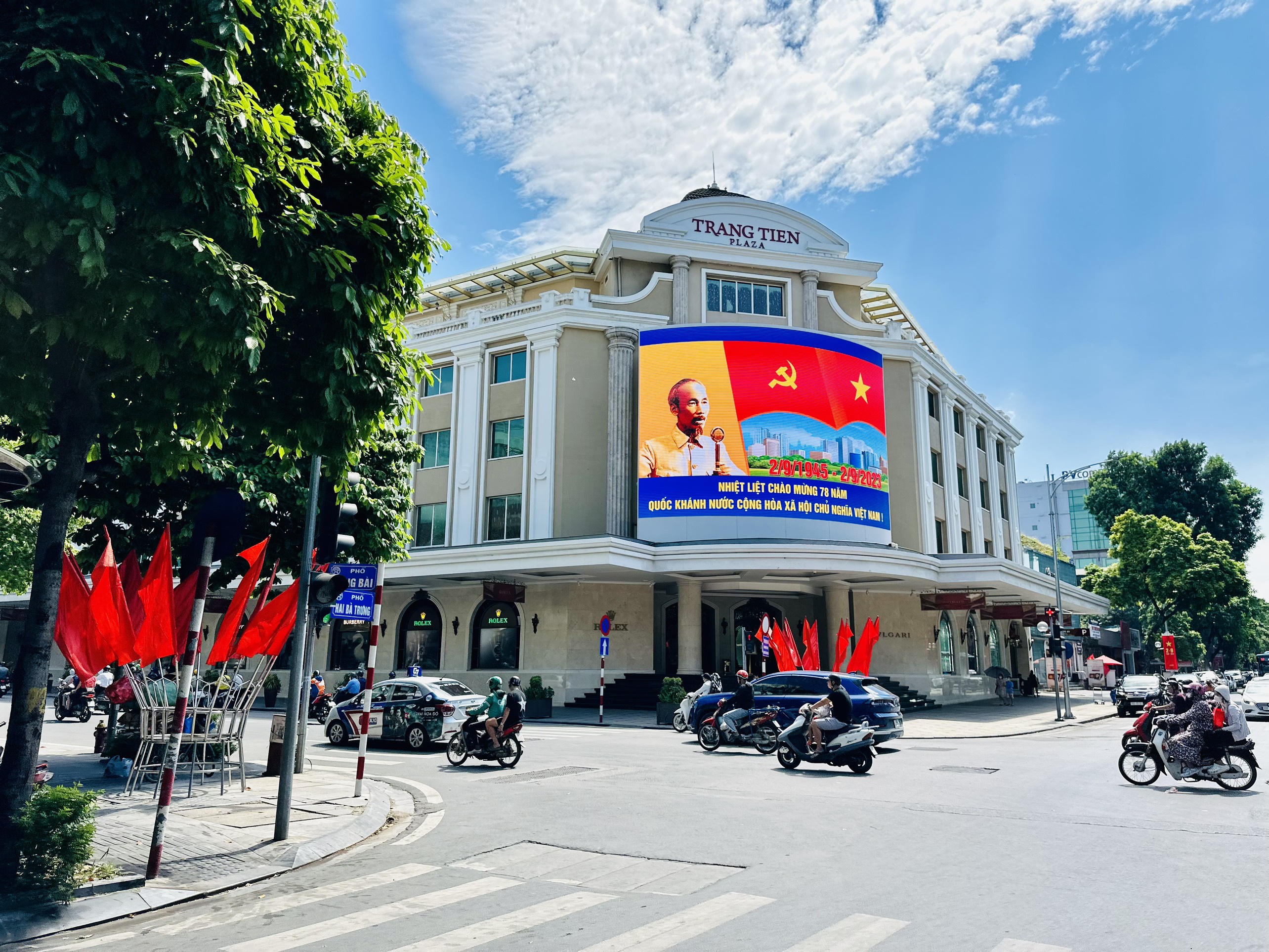 Màn hình led trước Trung tâm thương mại Tràng Tiền trình chiếu các đoạn video chào mừng ngày Quốc khánh 2/9.