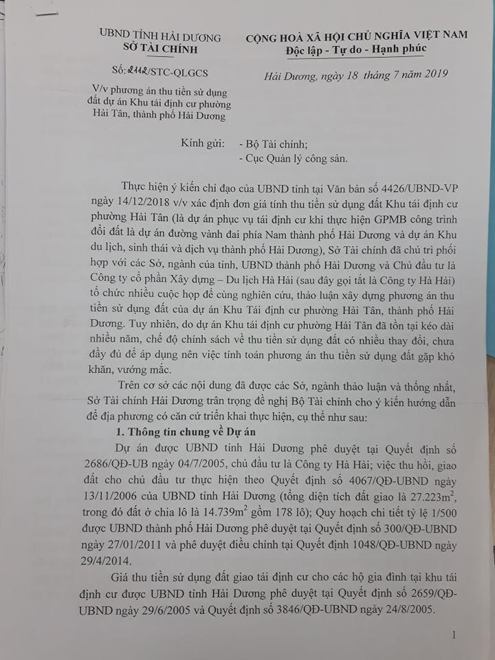 Ông Dương Văn Xuyên, cho biết, trước việc không thống nhất được giá thu tiền sử dụng đất, để giải quyết dứt điểm những vướng mắc kéo dài nhiều năm nay, bảo đảm hài hòa lợi ích của Nhà nước và nhà đầu tư, thực hiện ý kiến chỉ đạo của UBND tỉnh, ngày 18/7/2019, Sở Tài chính đã có văn bản số 2112 để xin ý kiến Bộ Tài chính đối với phương án thu tiền SDĐ Dự án khu TĐC phường Hải Tân.