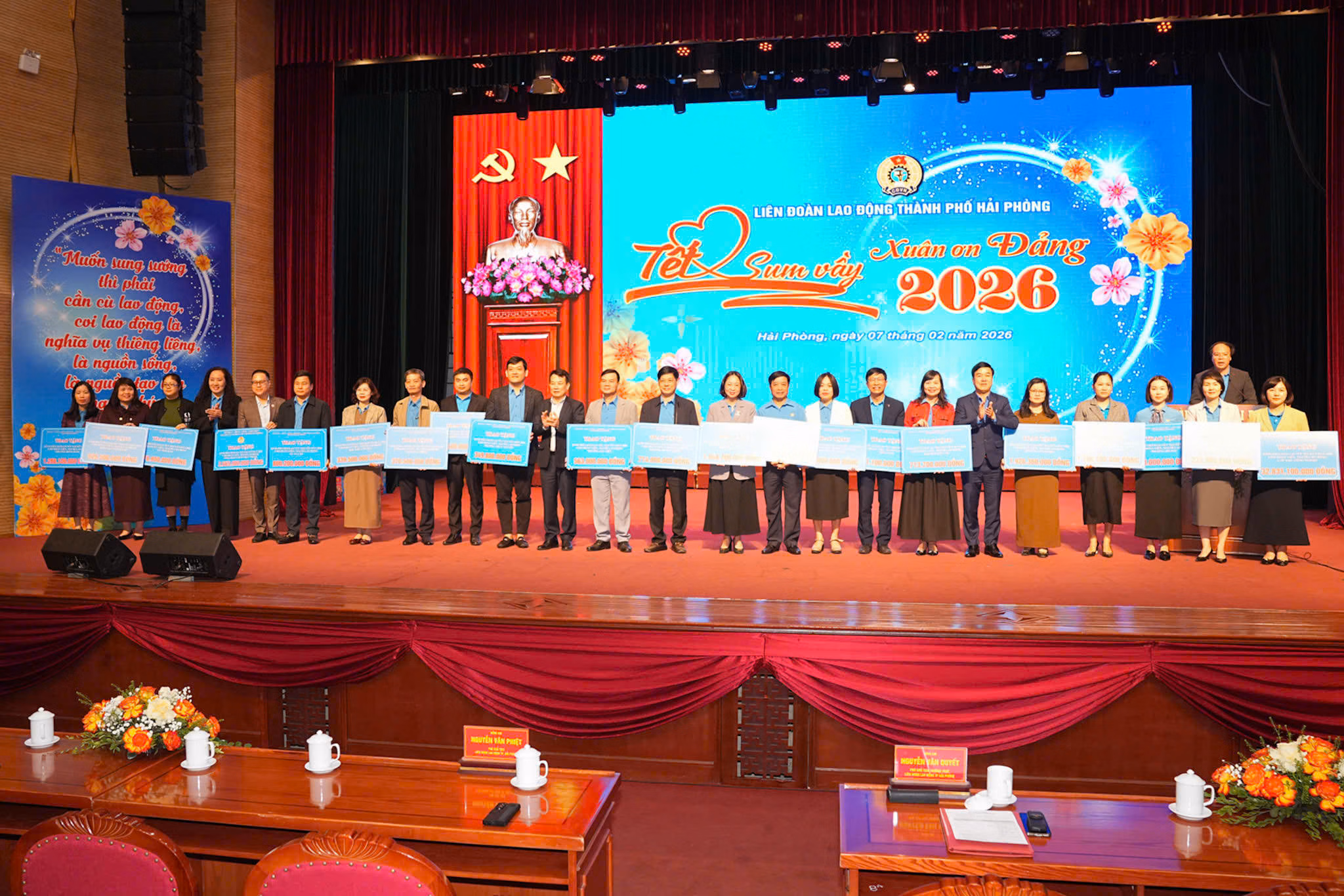 Nhân dịp này, lãnh đạo Đảng, Nhà nước, Ủy ban MTTQ Việt Nam, các Ủy ban của Quốc hội, Tổng Liên đoàn Lao động Việt Nam trao tặng 750 túi quà bằng hiện vật và 750 suất quà bằng tiền mặt với tổng kinh phí 1,275 tỷ đồng. Thành ủy, UBND TP Hải Phòng chi 11,8 tỉ đồng trợ cấp 11.800 người lao động hoàn cảnh khó khăn. Liên đoàn Lao động TP chi các hoạt động chăm lo Tết cho đoàn viên với số tiền hơn 49,6 tỷ đồng.