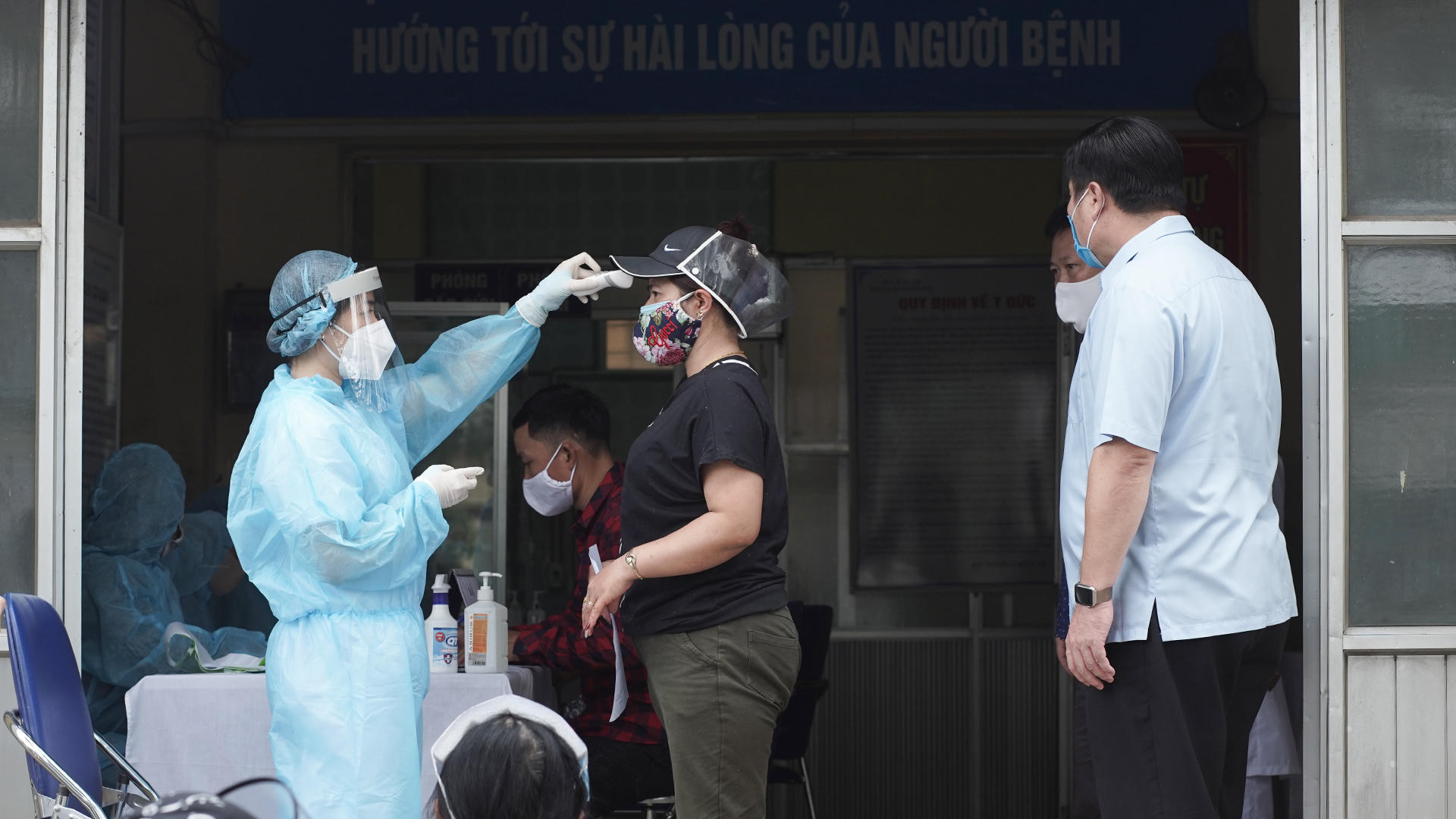 Sau đó mọi người được nhân viên y tế đo nhiệt độ để sàng lọc tình trạng sức khỏe ban đầu