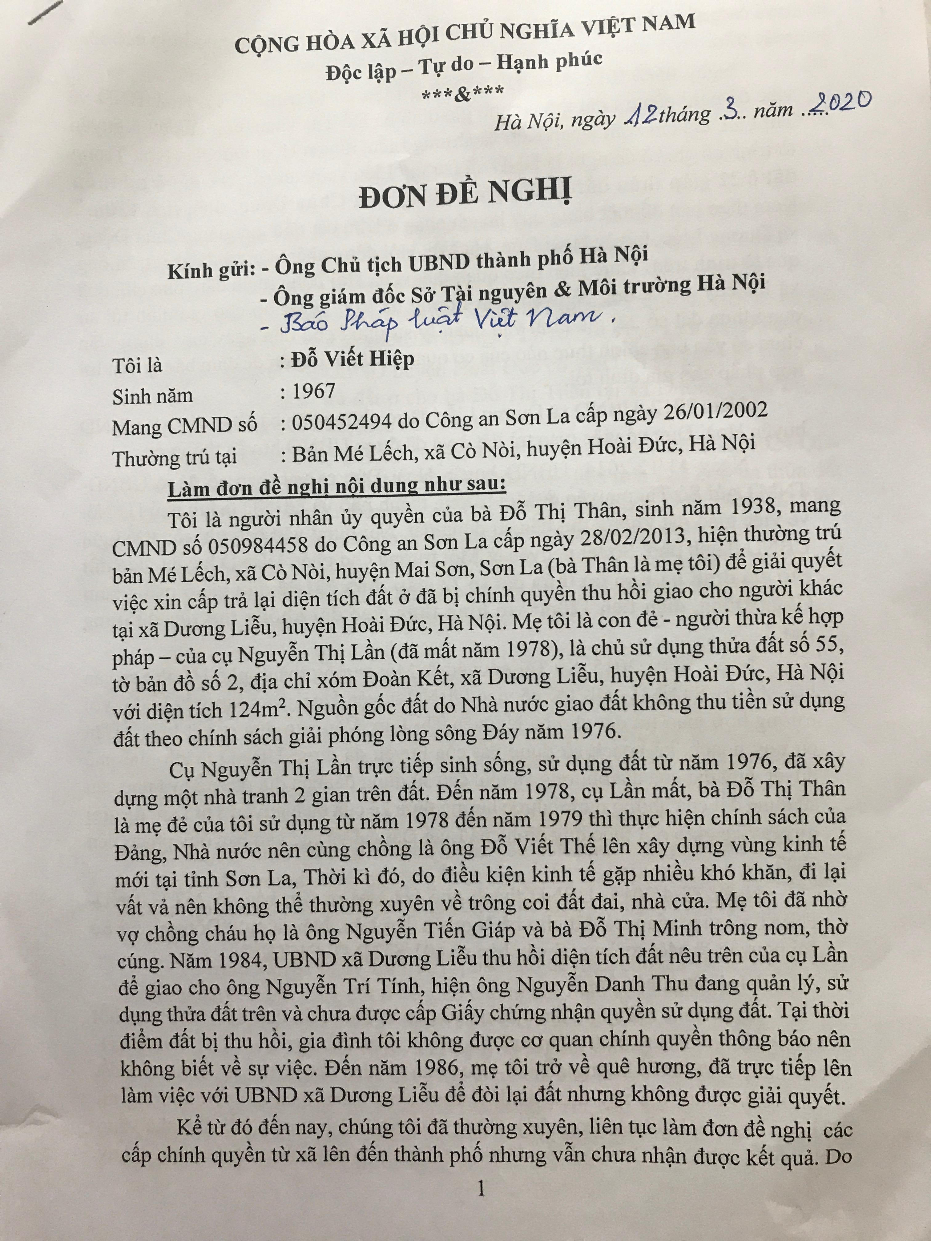 Ông Đỗ Viết Hiệp là người nhận ủy quyền của mẹ đẻ là bà Đỗ Thị Thân (người thừa kế hợp pháp của cụ Nguyễn Thị Lần) trong việc đề nghị UBND huyện Hoài Đức (Hà Nội) cấp trả diện tích đất đã bị chính quyền thu hồi trái phép của cụ Lần.