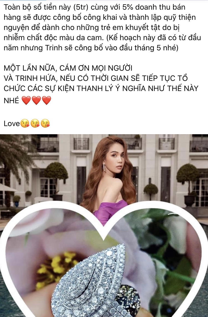 Đáng chú ý nhất, "nữ hoàng nội y" tiết lộ sẽ dùng 5 triệu đồng trong minigame và 5% tổng doanh thu đợt thanh lý để làm thiện nguyện: "Toàn bộ số tiền này (5 triệu đồng) cùng với 5% doanh thu bán hàng sẽ được công bố công khai và thành lập quỹ thiện nguyện để dành cho những trẻ em khuyết tật do bị nhiễm chất độc màu da cam. Kế hoạch này đã có từ đầu năm nhưng Trinh sẽ công bố vào đầu tháng 5 nhé".