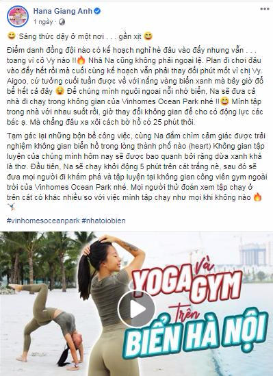 Trong khi đó, HLV thể thao Hannah Giang Anh lại tìm kiếm cảm hứng vận động tại Vinhomes Ocean Park. Cô đặc biệt ấn tượng về ‘không gian tập luyện được bao quanh bởi rặng dừa xanh nên thơ’ và công viên gym ngoài trời với 700 máy tập tại thành phố biển hồ. Tại đây, Hannah đã chia sẻ một bài tập buổi sáng hiệu quả và đầy năng lượng tại “phòng tập gym ngoài trời” của Ocean Park.