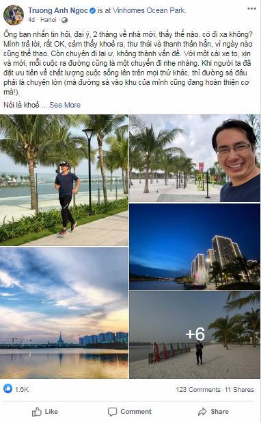 Chuyển về sinh sống tại Vinhomes Ocean Park, rất nhiều cư dân, trong số đó có nhà báo, bình luận viên thể thao Trương Anh Ngọc cảm thấy “khỏe ra, thư thái, thanh thản hẳn” bởi môi trường sống trong lành, nhiều cây xanh, hồ nước và chuỗi tiện ích thể thao tương thích với những người đam mê vận động.