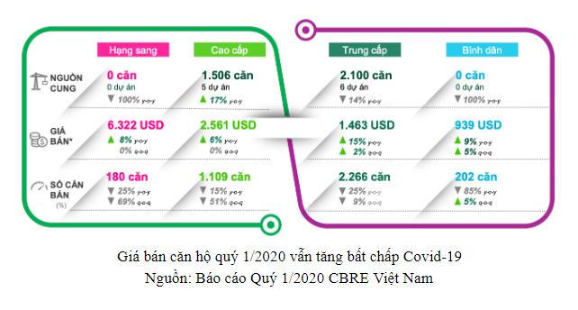 Bất chấp tác động của dịch bệnh Covid-19, cung cầu thị trường bất động sản vẫn diễn biến theo chiều hướng tương đối lạc quan. Theo báo cáo quý 1/2020 của Bộ Xây dựng cho biết, ở TP. Hồ Chí Minh, giá căn hộ chung cư tăng khoảng 3,50% so với cùng kỳ năm 2019. Trong đó đối với phân khúc căn hộ cao cấp giá tăng khoảng 2,75%, căn hộ trung cấp giá tăng khoảng 3,72%, căn hộ bình dân giá tăng khoảng 3,78%. Đối với nhà ở riêng lẻ giá tăng khoảng 8,36% so với cùng kỳ năm 2019.