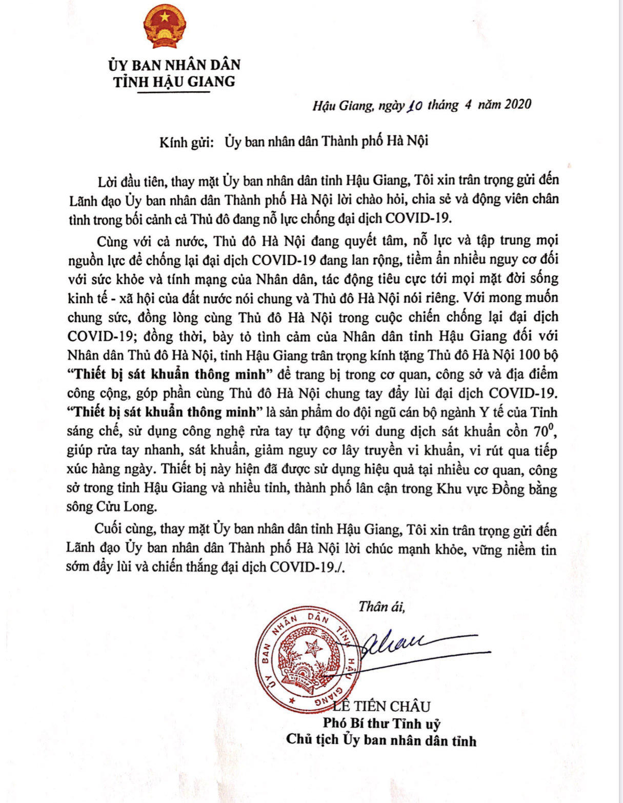 Theo đó, tỉnh sẽ tặng Hà Nội 100 máy, TP Hồ Chí Minh 100 máy và Cần Thơ 50 máy. Được biết, đây là sản phẩm do đội ngũ cán bộ ngành Y tế của tỉnh sáng chế, sử dụng công nghệ rửa tay tự động với dung dịch sát khuẩn cồn 70 độ, giúp rửa tay nhanh, sát khuẩn, giảm nguy cơ lây truyền vi khuẩn, vi rút qua tiếp xúc hàng ngày.