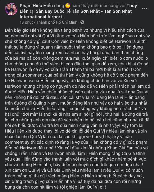 Trước làn sóng chỉ trích, Hiếu Hiền đã nhanh chóng lên tiếng bênh vực vợ và xin lỗi đến những người đang cảm thấy phẫn nộ ngoài kia. Bài đăng dài, nhưng anh muốn rằng mọi chuyện ồn ào sẽ sớm kết thúc tại đây để không còn phải lời ra tiếng vào hay cảm thấy mệt mỏi với nhau nữa.