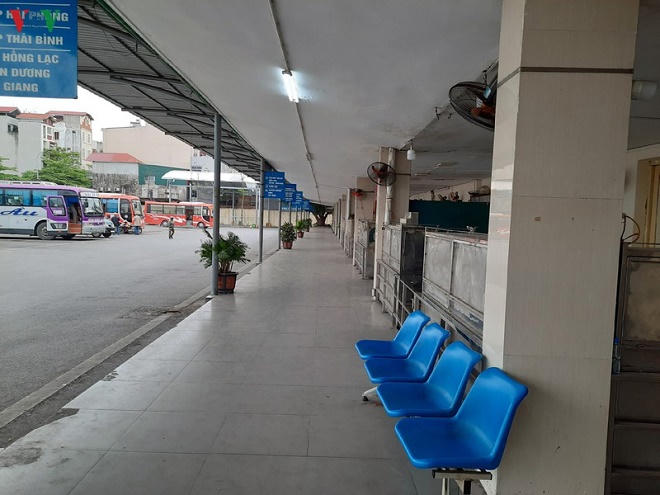 Hàng ghế chờ tại bến xe Gia Lâm vắng vẻ lạ thường. Ảnh VOV.
