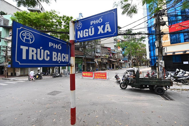 Khu vực phố Trúc Bạch, nơi phát hiện trường hợp bệnh nhân dương tính với virus SARS-CoV-2 vẫn được phong toả và cách ly nghiêm ngặt. Ảnh Lao động.