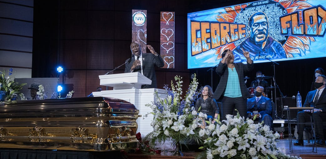 Luật sư Benjamin Crump trong lễ tang George Floyd.