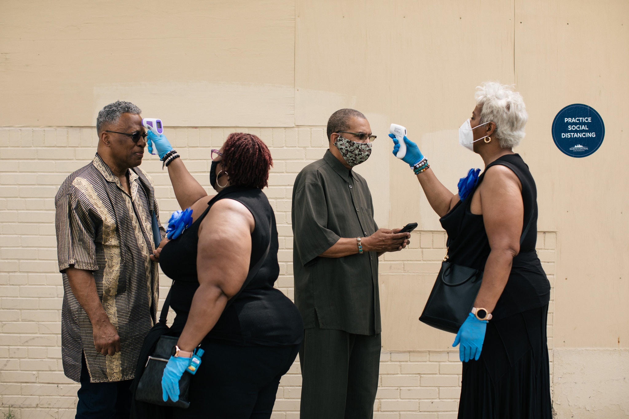 Khách đã được đo nhiệt độ trước khi vào nhà nguyện Đại học North Central, nơi tổ chức lễ tưởng niệm cho George Floyd.