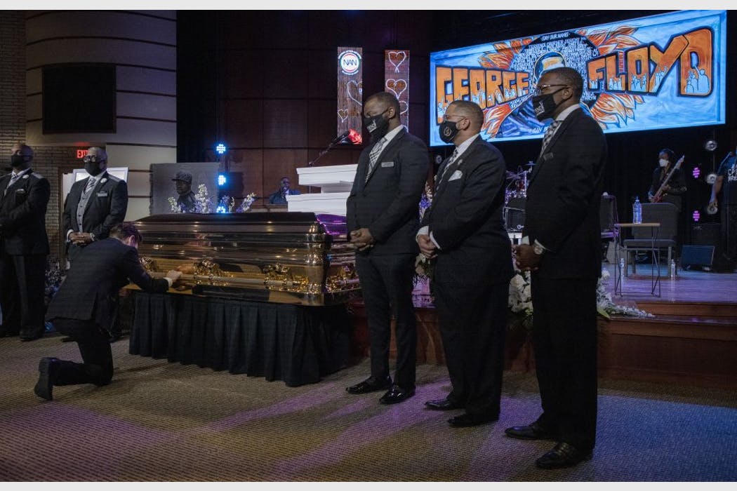 Thị trưởng thành phố Minneapolis Jacob Frey quỳ trước quan tài George Floyd.