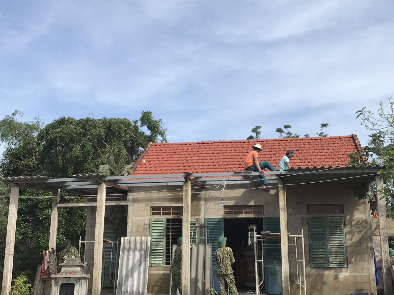 Lực lượng vũ trang tỉnh Thừa Thiên Huế giúp dân giằng chống nhà cửa, ứng phó với bão số 9.