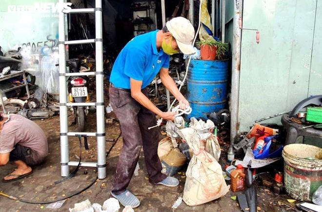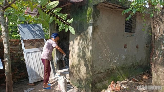 Bà Đặng Thị Hiên (75 tuổi, tổ 6, khối phố Hà My Đông B, phường Điện Dương, Thị xã Điện Bàn, Quảng Nam) vệ sinh hầm tránh bão bằng vôi bột, chuẩn bị mang đồ dùng, thực phẩm ra cất giữ để tránh bão.
