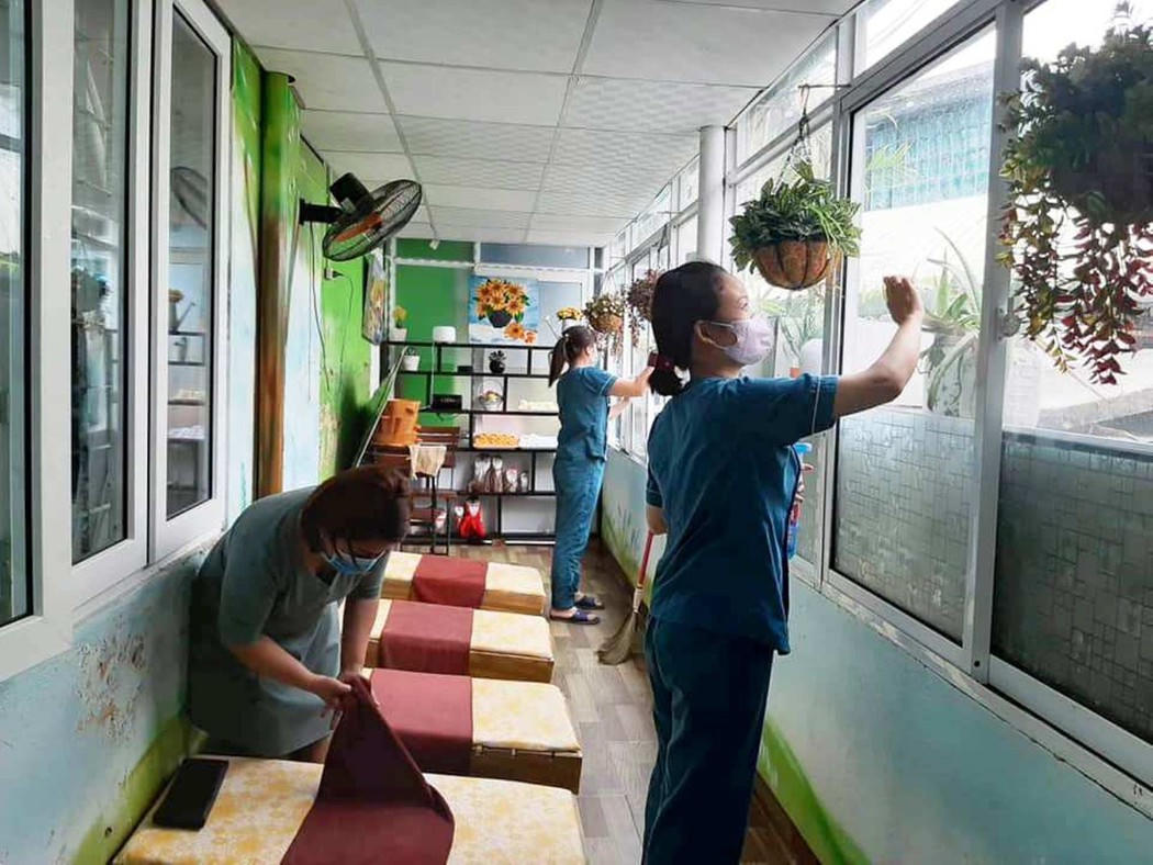Không những phải hỗ trợ nhân viên y tế thực hiện công tác phun thuốc diệt khuẩn, tất cả giáo viên phải lau dọn phòng học của lớp, từ cánh cửa lớn nhỏ, bàn ghế, nền nhà đến đồ dùng học tập, bảng lớp… Rồi quét sân trường, dọn rác vườn trường, chăm sóc vườn cây thuốc nam, nhiều trường có cả vườn rau, cây cảnh trước có các lớp trực chăm sóc, nay giáo viên phải thay các em làm việc này.
