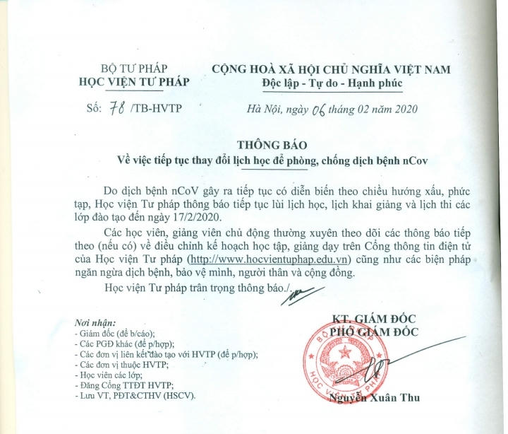 Trước đó, ngày 3/2/2020, Học viện Tư pháp đã phát đi thông báo cho học viên các lớp đào tạo của Học viện nghỉ học đến hết 09/02/2020.