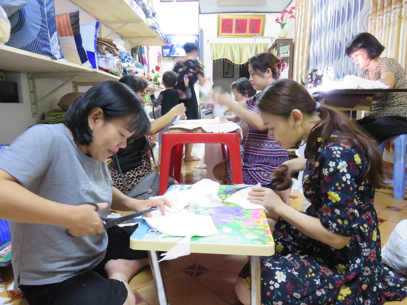 Hầu hết mọi người đều là tay ngang, trừ chị Mai chủ nhà làm nghề may, nhưng mọi người đều vào việc thuận lợi. Quang cảnh tiệm may đầy khẩn trương, “sản xuất dây chuyền” như: nhóm xếp vải, nhóm vẽ (hình khẩu trang theo mẫu đã chọn), nhóm cắt, nhóm may hoàn chỉnh. Các khâu sau cùng là giặt, hấp tiệt trùng và vào bì.