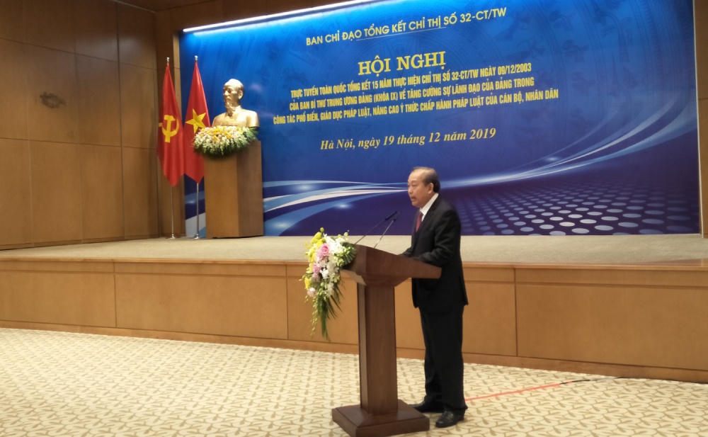 (PLVN) - Sáng nay 19/12, tại Trụ sở Chính phủ đã diễn ra Hội nghị trực tuyến toàn quốc tổng kết 15 năm thực hiện Chỉ thị số 32-CT/TW ngày 09/12/2003 của Ban Bí thư về tăng cường sự lãnh đạo của Đảng trong công tác phổ biến, giáo dục pháp luật (PBGDPL), nâng cao ý thức chấp hành pháp luật của cán bộ, nhân dân.