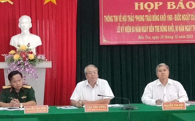 (PLVN) - Chiều ngày 16/12, tại hội trường ban tuyên giáo tỉnh Bến Tre, diễn ra buổi họp báo để thông tin chương trình tổ chức hội thảo khoa học Quốc gia; kỷ niệm phong trào Đồng Khởi (1960–2020); 60 năm (1920 – 2020) ngày sinh của nữ tướng Anh hùng lực lượng vũ trang nhân dân Nguyễn Thị Định và kỷ niệm 90 năm ngày thành lập Đảng(1930 – 2020).