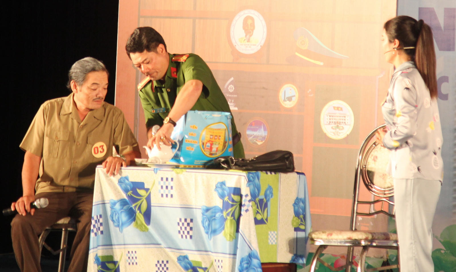 Đơn vị Công an tỉnh với tiểu phẩm “Hối hận trong đời” đã nói lên thực trạng chống người thi hành công vụ xảy ra trong ngành giao thông. Từ một tình huống đua xe trái phép dẫn đến tai nạn chết người, tiểu phẩm lồng ghép tuyên truyền Luật Giao thông đường bộ về các hành vi bị nghiêm cấm khi tham gia giao thông với mức phạt cụ thể, rõ ràng.
