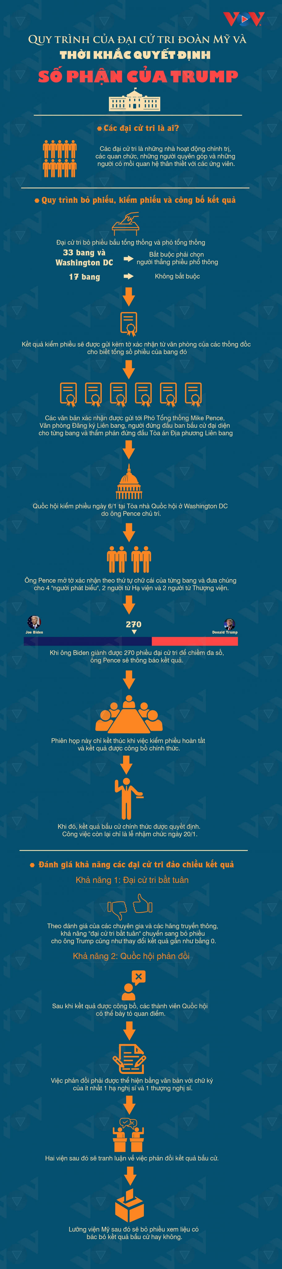 Theo quy định, các đại cử tri sẽ họp vào ngày thứ Hai sau thứ Tư thứ hai trong tháng 12, tức ngày 14/12 năm nay, để bầu tổng thống và phó tổng thống. Thông thường đại cử tri sẽ bỏ phiếu theo kết quả bầu cử phổ thông của bang. Trước đó, toàn bộ 50 bang Mỹ đã chứng nhận kết quả bầu cử, với chiến thắng phiếu phổ thông thuộc về Joe Biden.