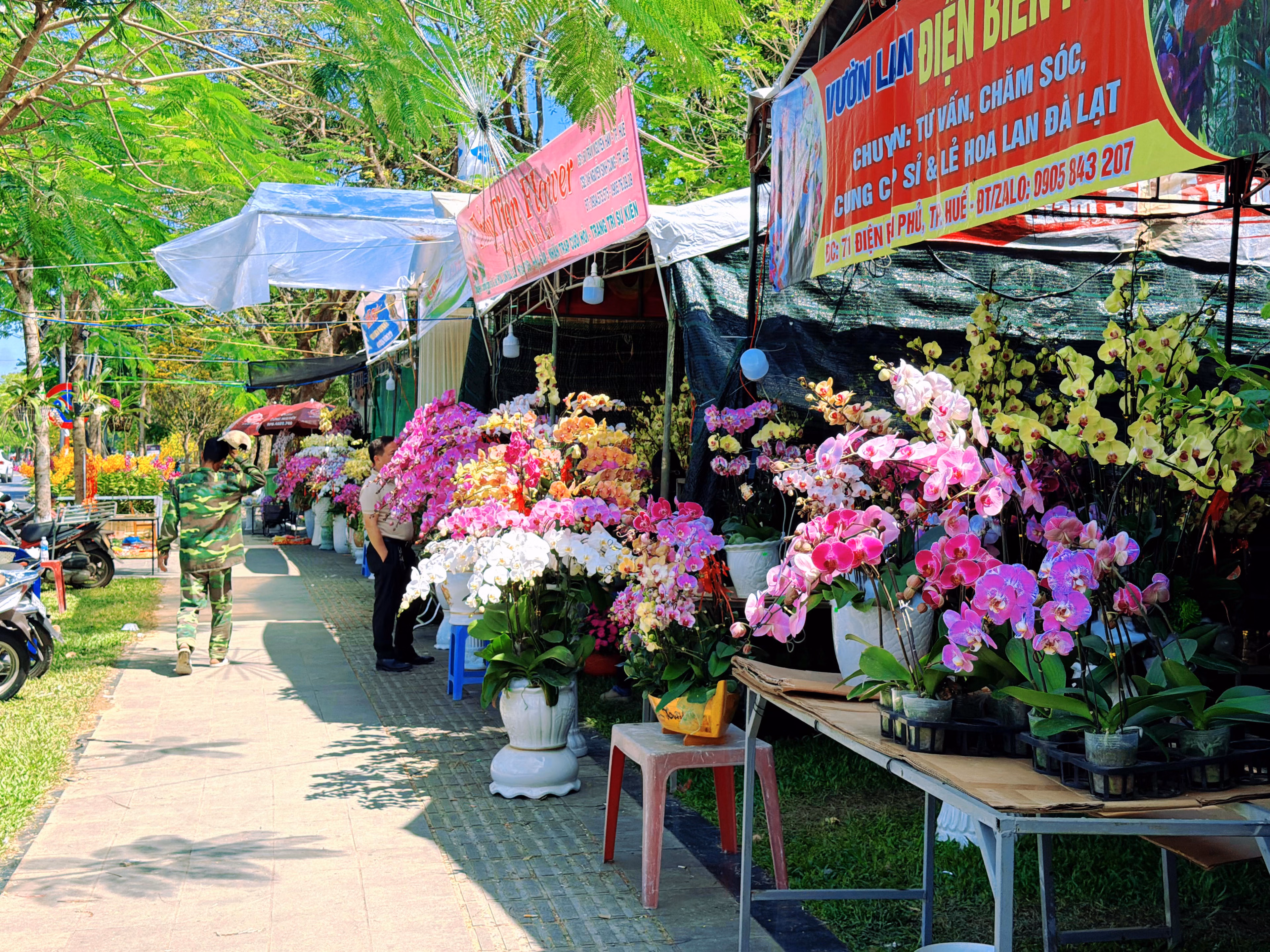 Khu chợ hoa nhộn nhịp với nhiều loại lan phục vụ nhu cầu mua sắm, trang trí nhà cửa dịp Tết của người dân Cố đô.