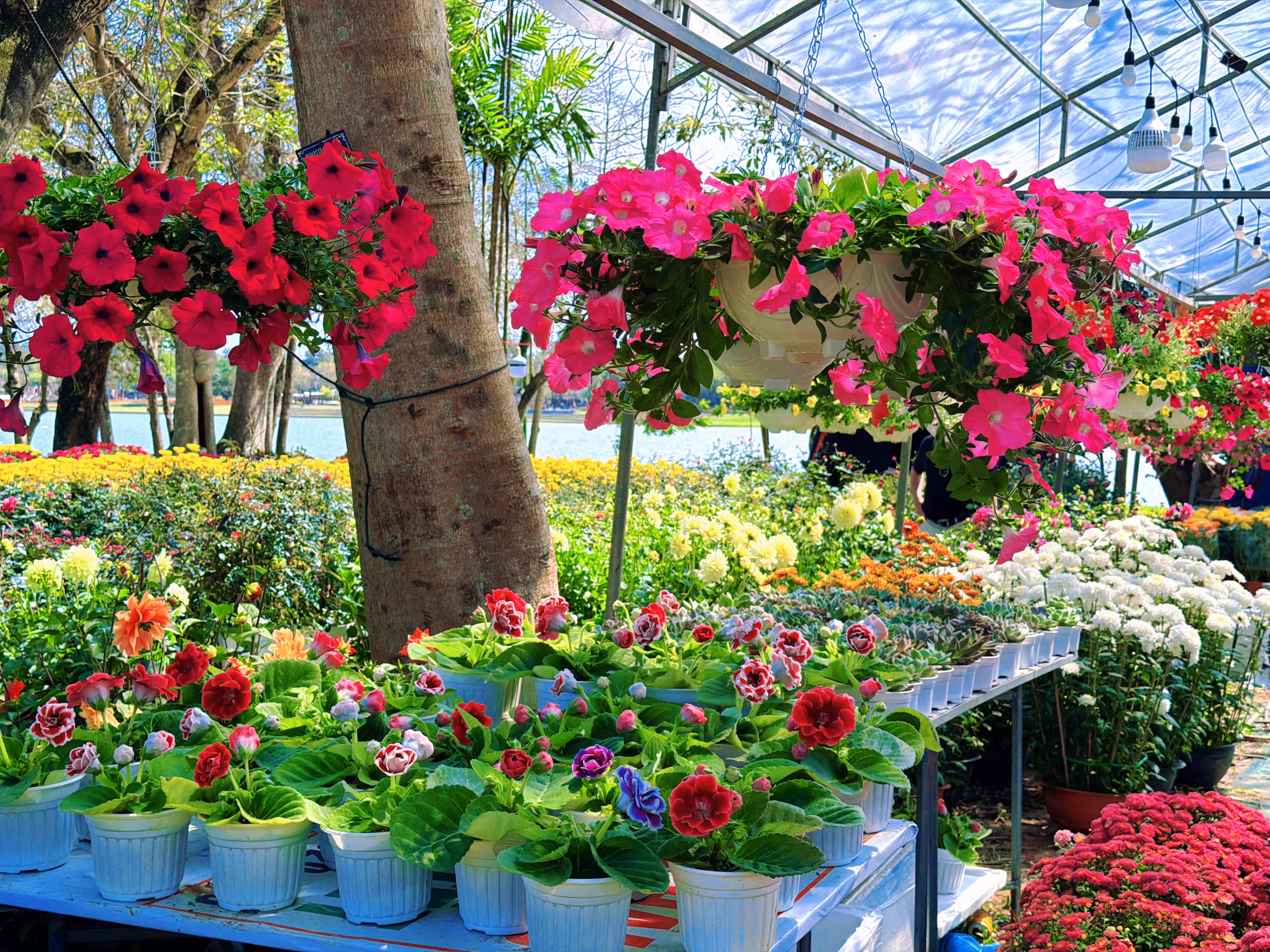 Các gian hàng hoa kiểng được bày trí bắt mắt với đủ sắc màu, từ hoa treo, hoa chậu đến các loại hoa nền, góp phần làm không gian Tết thêm sinh động bên dòng Sông Hương.