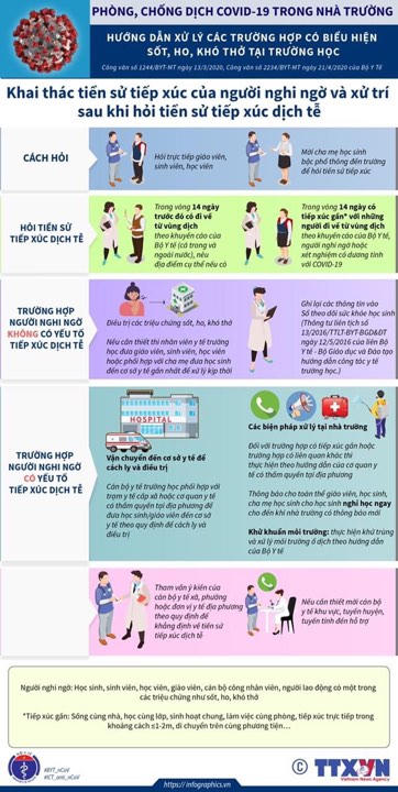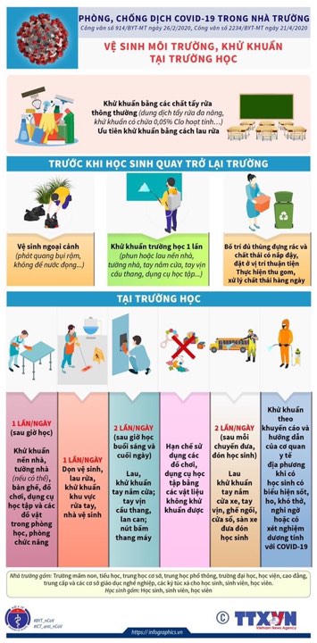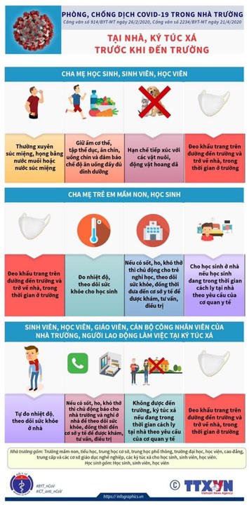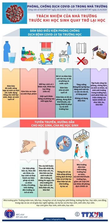 Bộ Y tế đã gửi Công văn số 914/BYT-MT ngày 26/2/2020, Công văn số 1244/BYT-MT ngày 13/3/2020, Công văn số 2234/BYT-MT ngày 21/4/2020) đến Bộ Giáo dục và Đào tạo về thực hiện công tác phòng, chống dịch COVID-19 trong nhà trường.