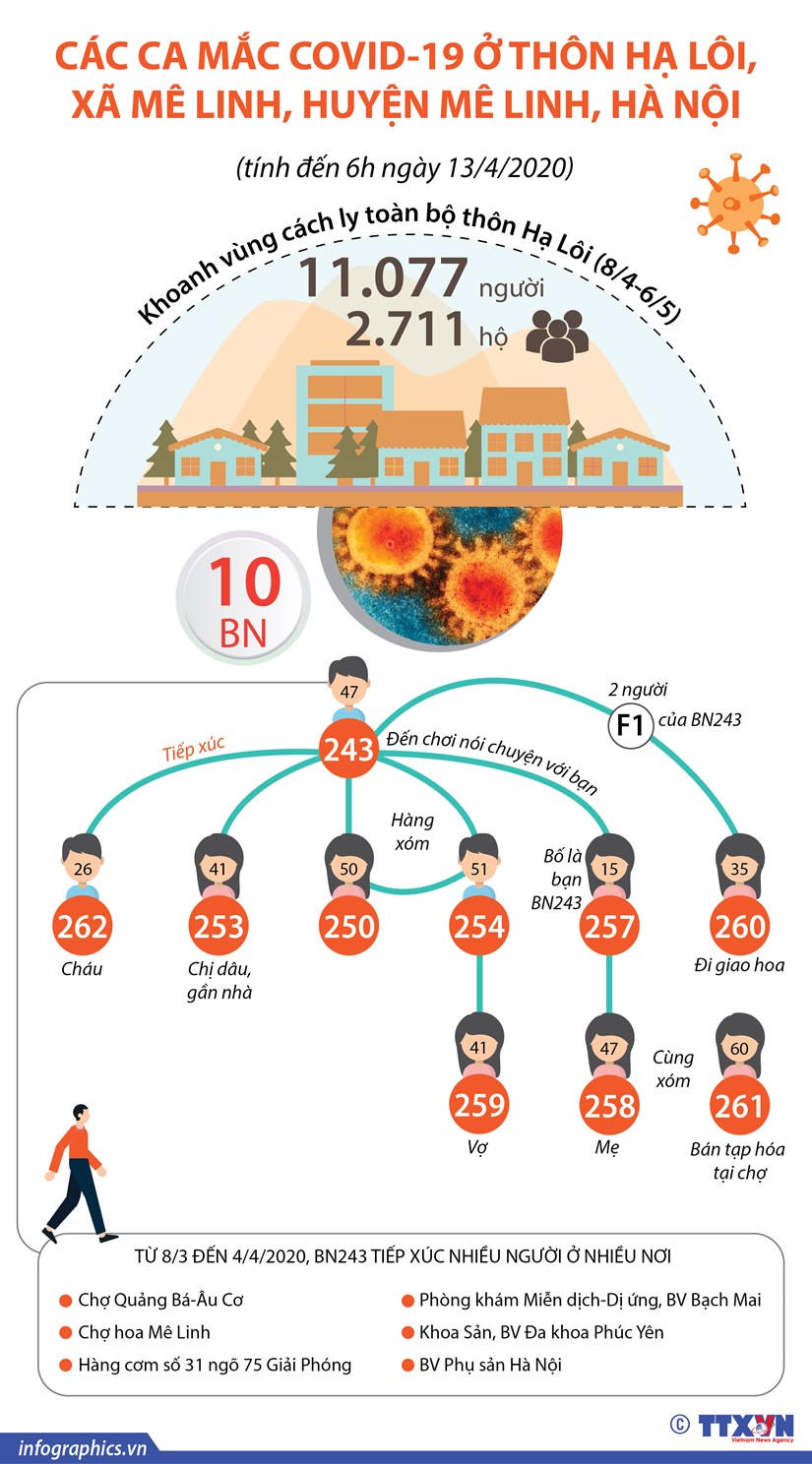 Tính đến 6 giờ ngày 13/4, đã có 10 người mắc COVID-19 tại thôn Hạ Lôi, xã Mê Linh, huyện Mê Linh, Hà Nội.