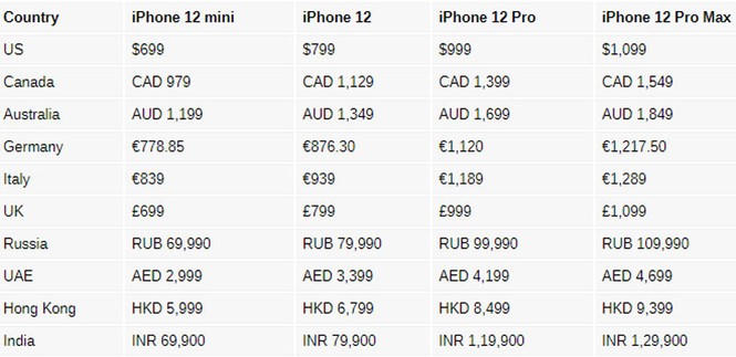 iPhone 12 và iPhone 12 Mini có 5 tùy chọn màu sắc gồm đen, trắng, đỏ, xanh lam, xanh lục. iPhone 12 Pro và iPhone 12 Pro Max có 4 màu bạc, than chì, vàng và xanh dương. iPhone 12, iPhone 12 Pro bắt đầu nhận đơn đặt hàng ở một số quốc gia, vùng lãnh thổ vào ngày 16/10, lên kệ sau đó 1 tuần. iPhone 12 Mini và 12 Pro Max nhận đơn đặt hàng vào ngày 6/11, bán ra từ 13/11. Mức giá cụ thể như sau: