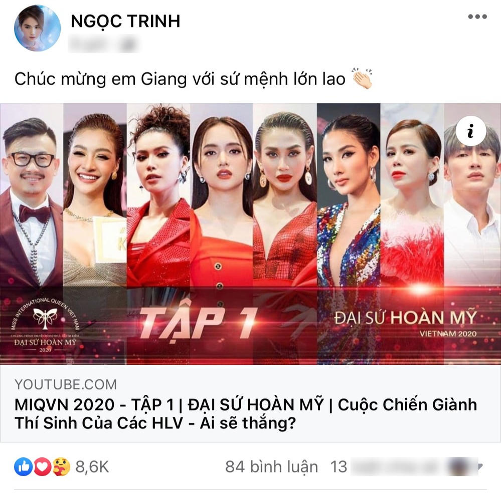 Không những thế, Ngọc Trinh còn đích thân chia sẻ lại chương trình thực tế Đại Sứ Hoàn Mỹ 2020 để ủng hộ bạn mình với lời nhắn: "Chúc mừng em Giang với sứ mệnh lớn lao".