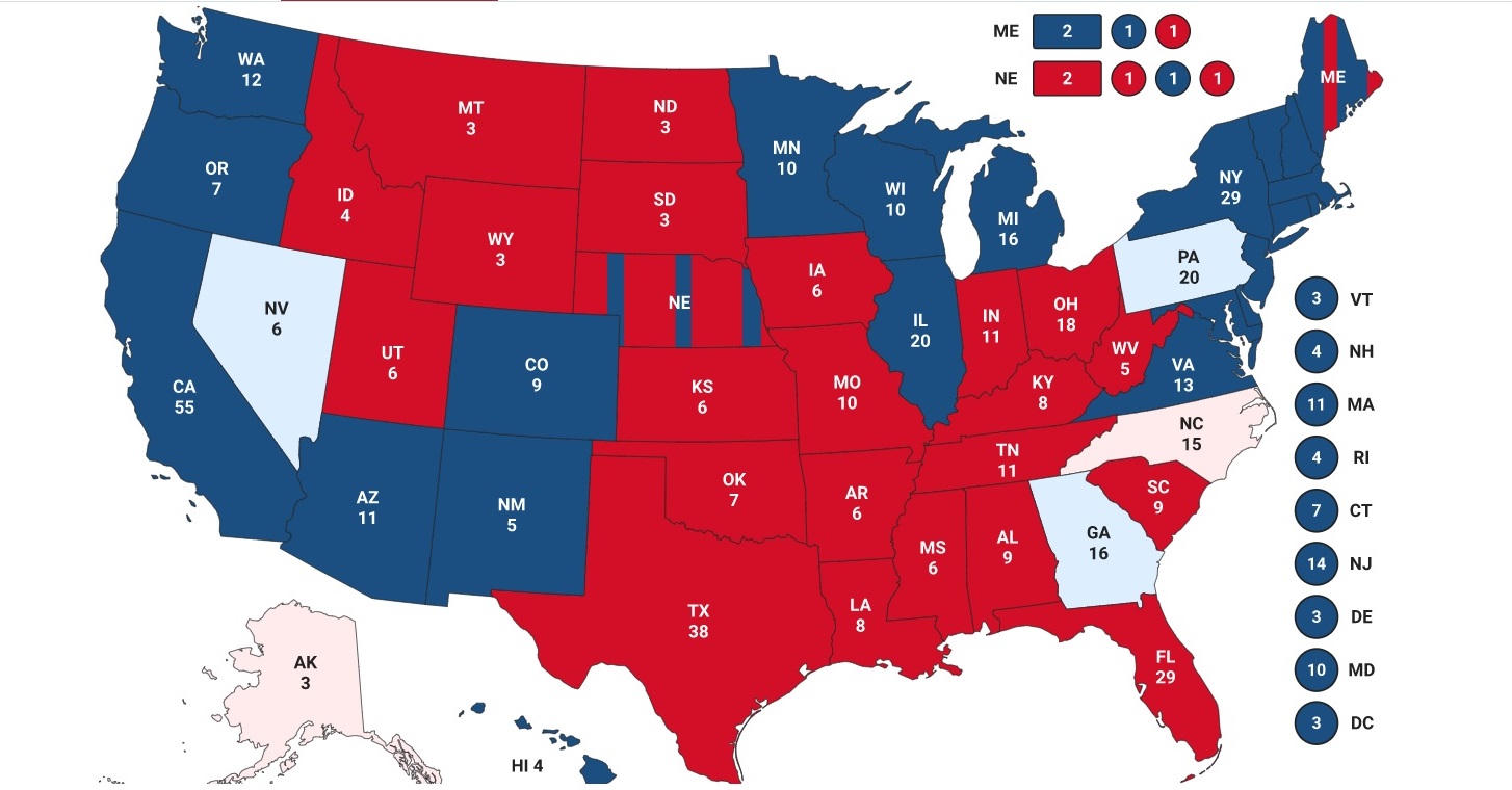 Ông Biden hiện vẫn có 253 phiếu đại cử tri và ông Trump hiện có 213 phiếu đại cử tri. Liên quan đến tiến trình kiểm phiếu tại các bang "chiến trường", hiện đang diễn ra quá trình bám đuổi rất sít sao giữa 2 ứng cử viên của 2 đảng.