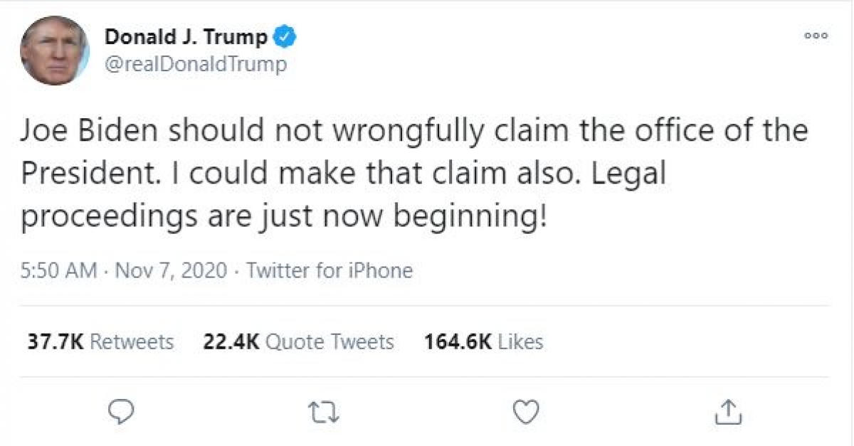 Trong dòng trạng thái đăng trên Twitter sáng ngày 7/11 (theo giờ Việt Nam), ông Donald Trump nói đối thủ Joe Biden không nên tuyên bố chiến thắng cuộc đua tổng thống một cách sai trái. "Tôi cũng có thể tuyên bố chiến thắng như vậy. Các thủ tục pháp lý giờ mới bắt đầu", ông Trump viết.