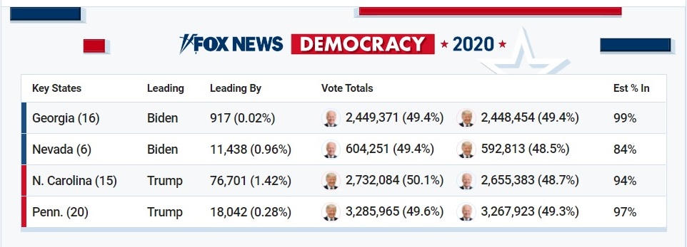 Hiện tại, kết quả kiểm phiếu tại một số bang vẫn chưa thể hiện rõ ai sẽ là người chiến thắng và giành được số phiếu đại cử tri tại các bang này bao gồm Nevada, Pennsylvania, Bắc Carolina, Georgia và Alaska.