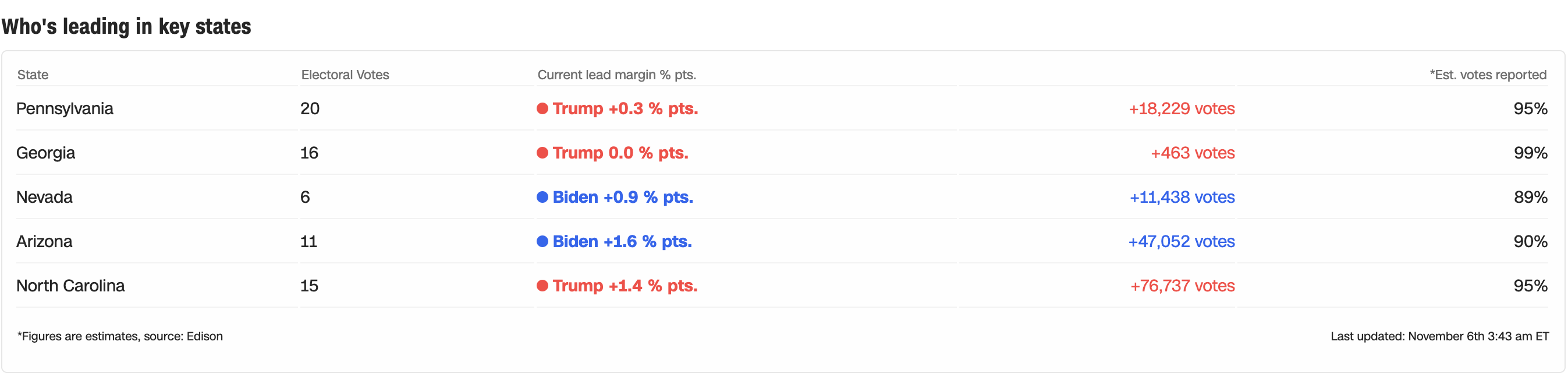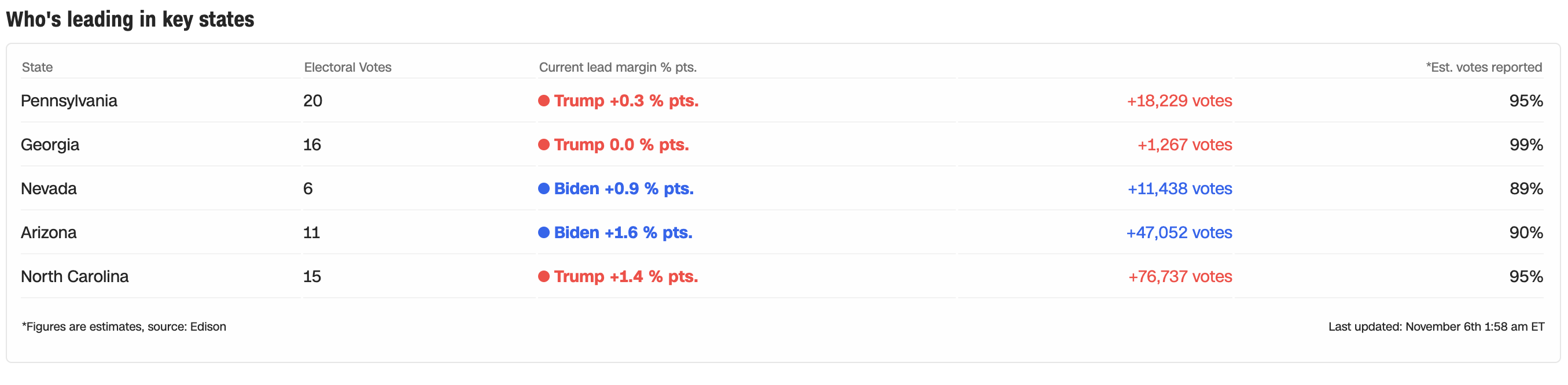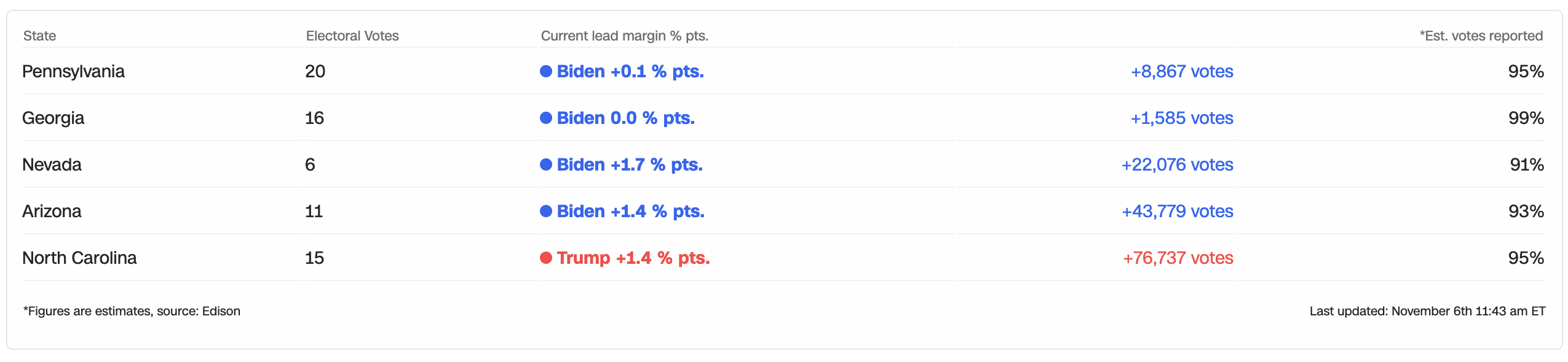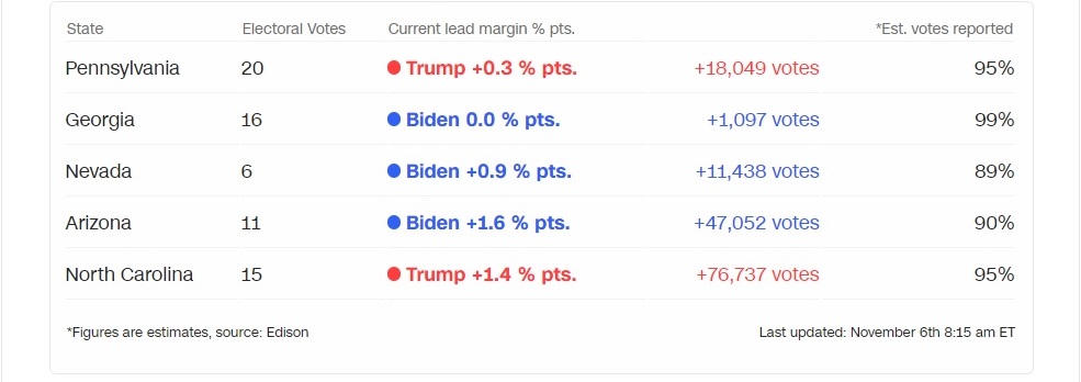 Năm tiểu bang nữa - Alaska, Arizona, Georgia, Nevada và Bắc Carolina - vẫn chưa có kết quả cuối cùng. Trump dẫn đầu ở Alaska và Bắc Carolina, trong khi Biden dẫn đầu ở Arizona, Georgia và Nevada.