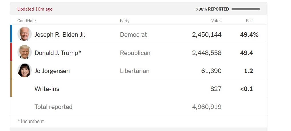 Lúc 11.00 ngày 6/11 (giờ địa phương), số phiếu ở bang này đang rất sít sao giữa 2 ứng viên tổng thống, khi Biden đang dẫn trước Trump chỉ với 1.586 phiếu.