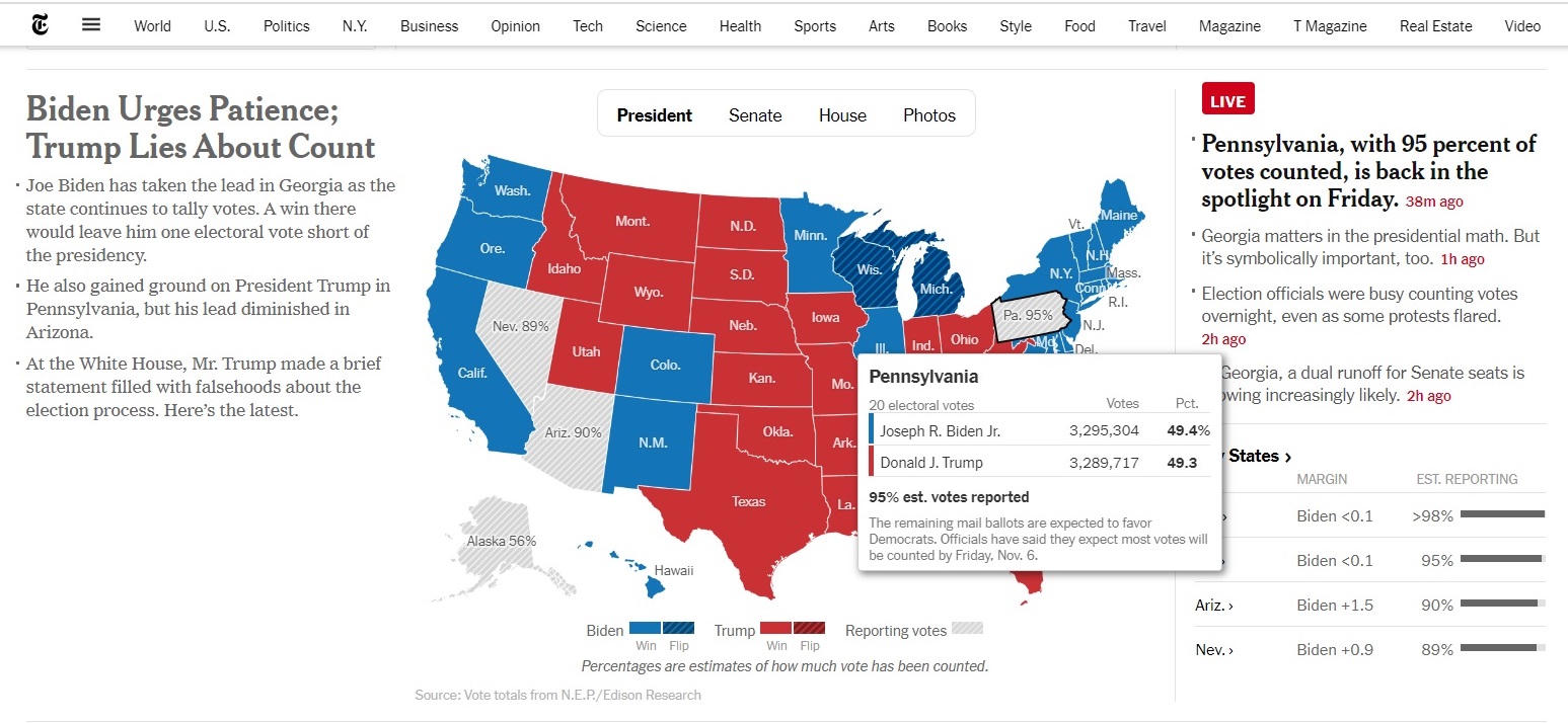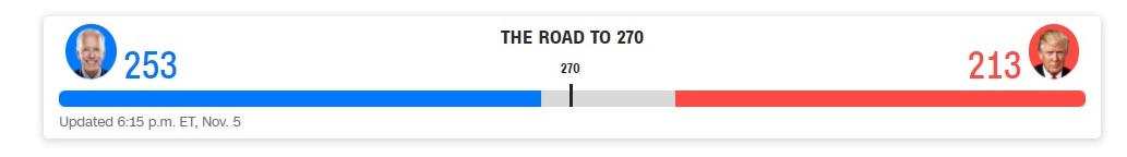 Tới thời điểm này, vẫn chưa có ứng cử viên nào đạt đủ 270 phiếu đại cử tri cần thiết để có thể tuyên bố thắng cử trong bối cảnh một số bang tại Mỹ vẫn chưa hoàn tất quá trình kiểm phiếu. Theo các cơ quan tin tức như CNN, New York Times…, ứng cử viên Dân chủ Joe Biden vẫn đang tiếp tục dẫn trước với 253 phiếu đại cử tri so với 213 phiếu của ứng cử viên Cộng hòa Donald Trump.