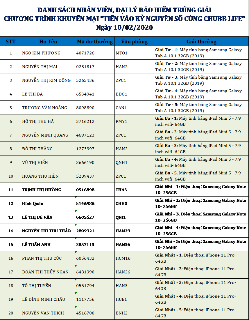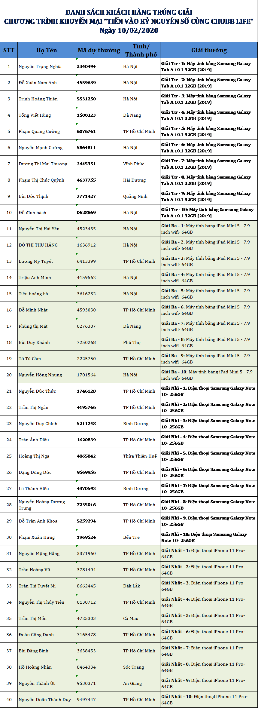 Chubb Life Việt Nam xin gửi lời chúc mừng đến chủ nhân của các phần quà công nghệ hấp dẫn. Công ty sẽ trực tiếp liên hệ với người trúng giải để gửi các phần quà trong thời gian sớm nhất.