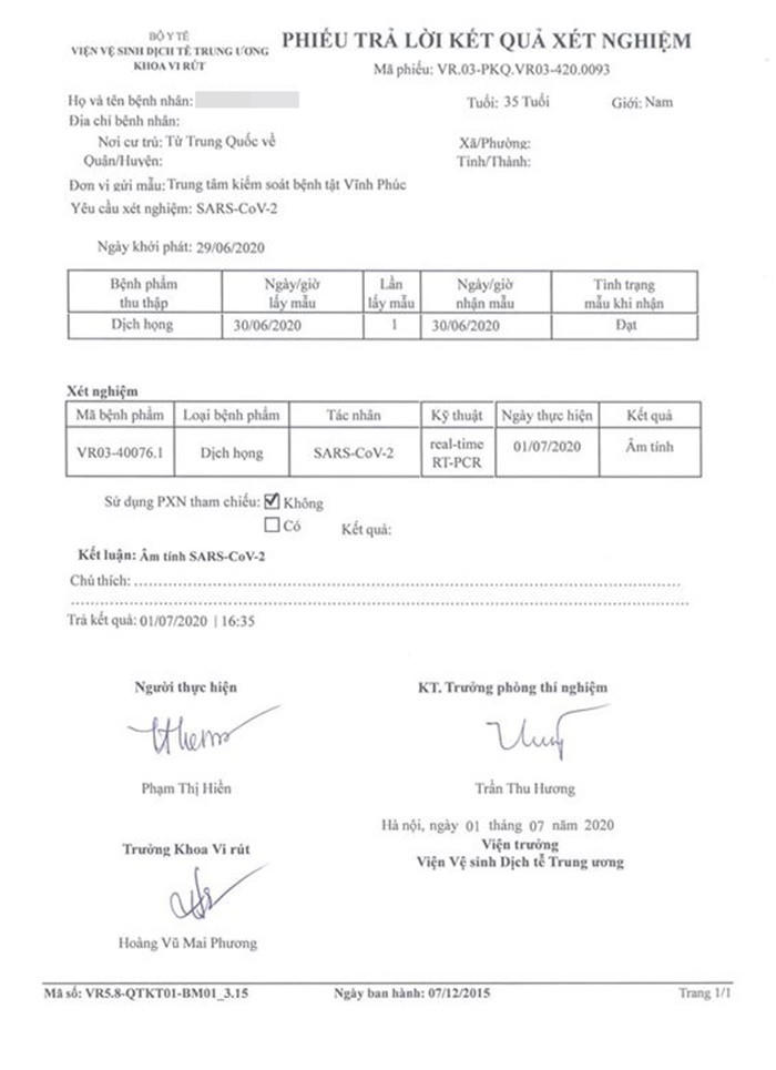 Xét nghiệm được thực hiện với mẫu dịch họng gửi tới Viện Vệ sinh dịch tễ Trung ương ngày 30/6.