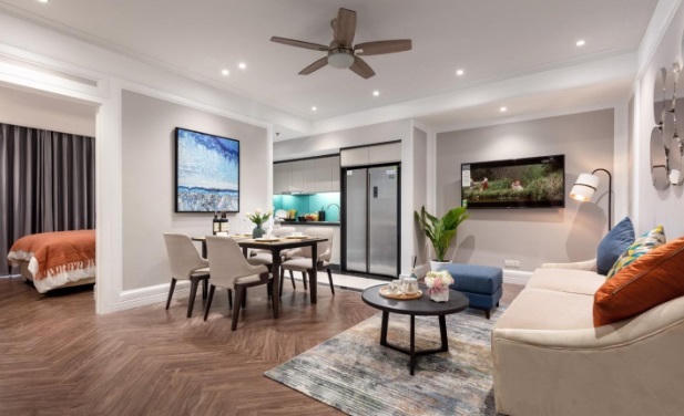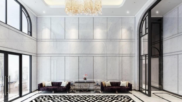 Gạch lát của tòa nhà sử dụng loại giả đá trắng Volakas Hy Lạp kết hợp với gạch ghi xám như những bãi cát trải dài kết hợp với sàn gỗ cao cấp được lát theo hình xương cá, chi tiết này giúp chủ nhân căn hộ dễ dàng thiết kế và phối đồ nội thất theo các phong cách khác nhau để tạo nên không gian sống theo đúng nhu cầu và sở thích.