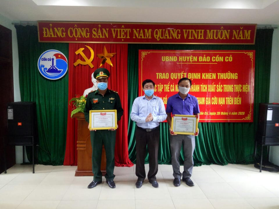 Ngày 20/4, UBND huyện Đảo Cồn Cỏ tổ chức trao quyết định số 40/QĐ_UBND ngày 16 tháng 4 năm 2020 về việc khen thưởng đột xuất cho 2 tập thể và 3 cá nhân đã có thành tích đặc biệt xuất sắc trong tham gia cứu hộ, cứu nạn trên biển. 2 tập thể được UBND huyện khen thưởng là Đồn Biên phòng Cồn Cỏ và Trung tâm y tế huyện đảo Cồn Cỏ.