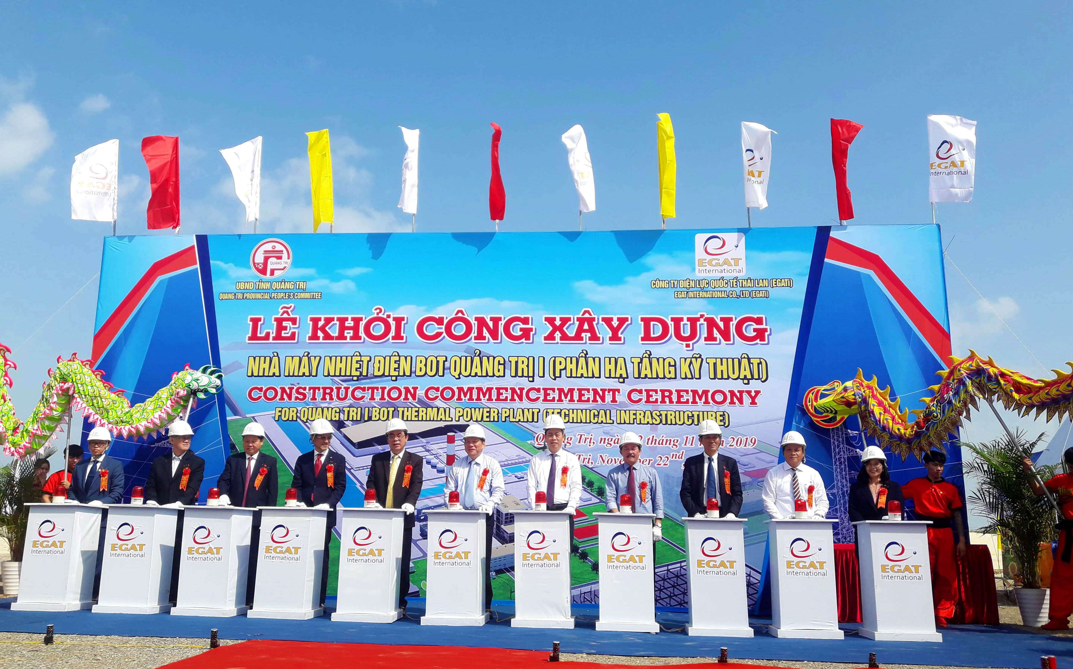 (PLVN) - Ngày 22/11, UBND tỉnh Quảng Trị phối hợp với Công ty Điện lực Quốc tế Thái Lan (EGATi) tổ chức lễ khởi công xây dựng Nhà máy nhiệt điện BOT Quảng Trị 1 (phần hạ tầng kĩ thuật) tại khu vực xã Hải Khê, huyện Hải Lăng.