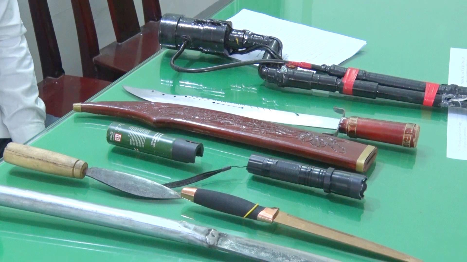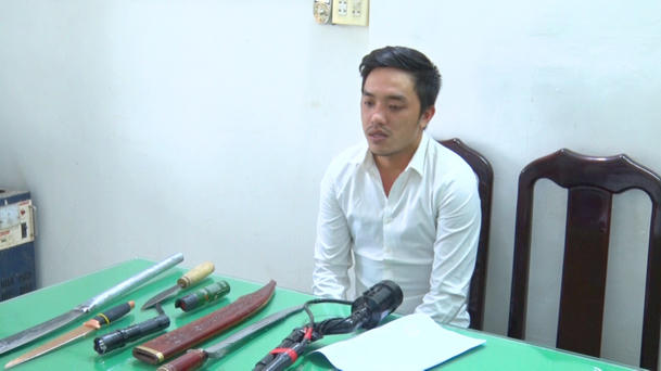 Qua kiểm tra trên người đối tượng, lực lượng chức năng thu giữ 4 bọc nylon trong suốt, chứa tinh thể màu trắng bên trong (nghi là ma túy); 1 điện thoại di động và 9 triệu 700 ngàn đồng. Ngoài ra, lực lượng chức năng còn thu giữ nhiều dụng cụ phân chia ma túy và một số hung khí như dao tự chế, súng tự chế, bình xịt hơi cay,...
