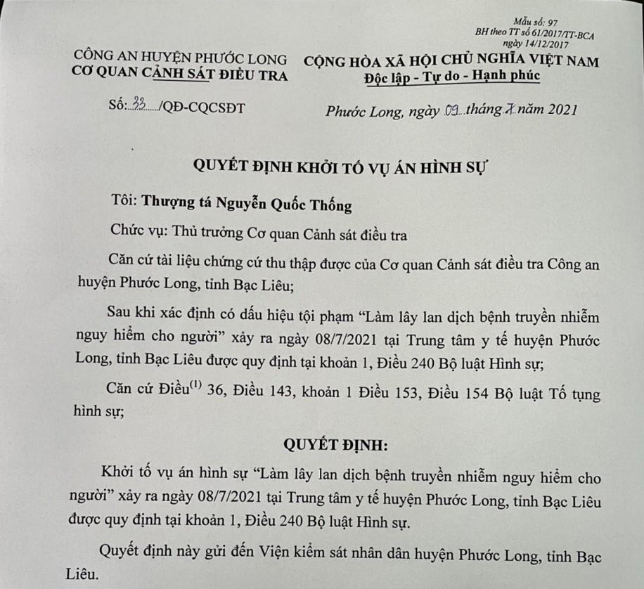 (PLVN) - Chiều nay (9/7), Cơ quan Cảnh sát điều tra Công an huyện Phước Long (Bạc Liêu) cho biết, đơn vị vừa ra Quyết định khởi tố vụ án hình sự “làm lây lan dịch bệnh nguy hiểm cho người” xảy ra vào ngày 8/7 tại Trung tâm Y tế huyện Phước Long.