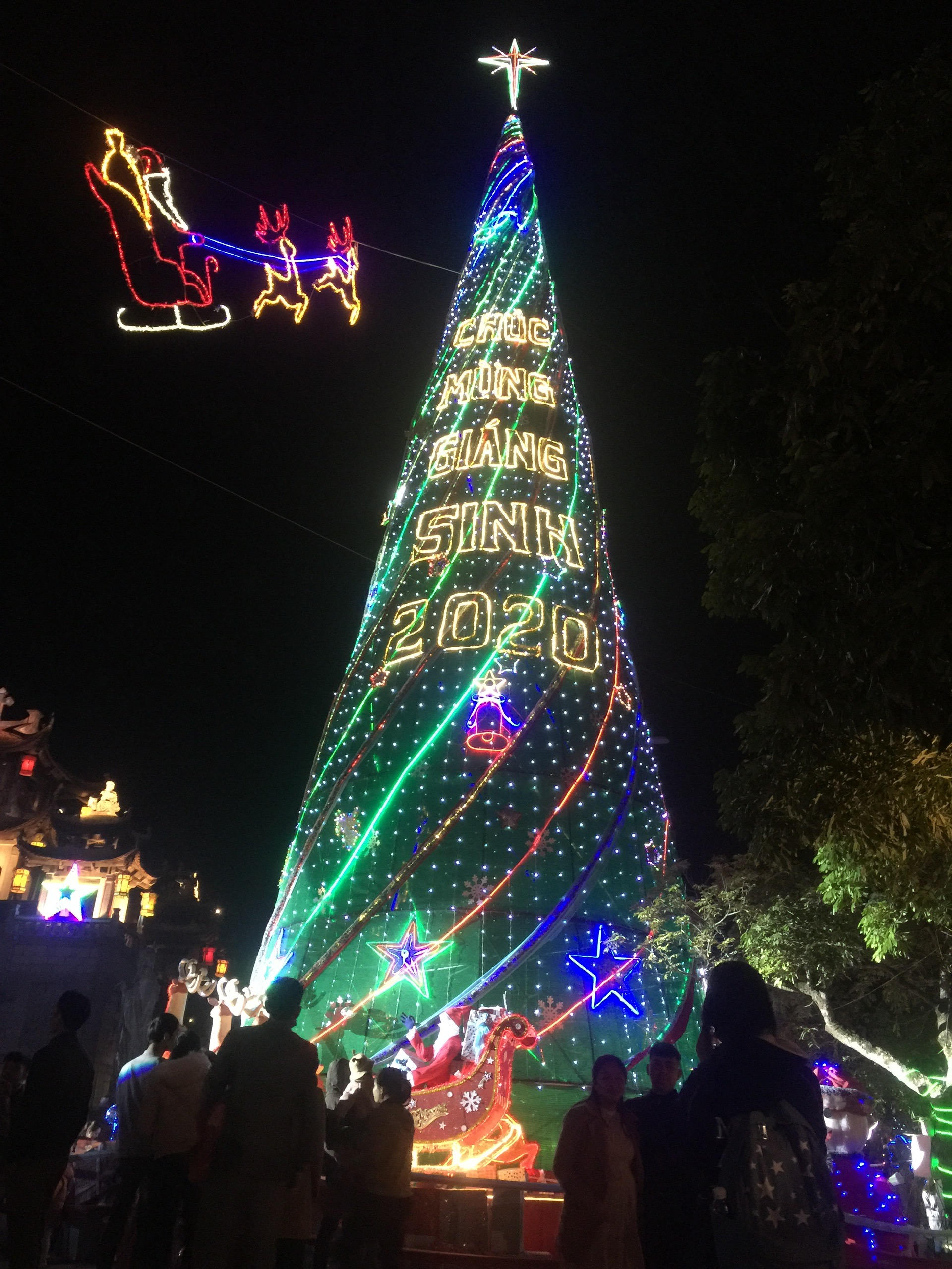 Cây thông Noel cao 25m được trang trí bằng bạt vải, các sợi ruybăng và đèn điện là một trong những điểm nổi bật khi đến nhà thờ chính tòa Phát Diệm.