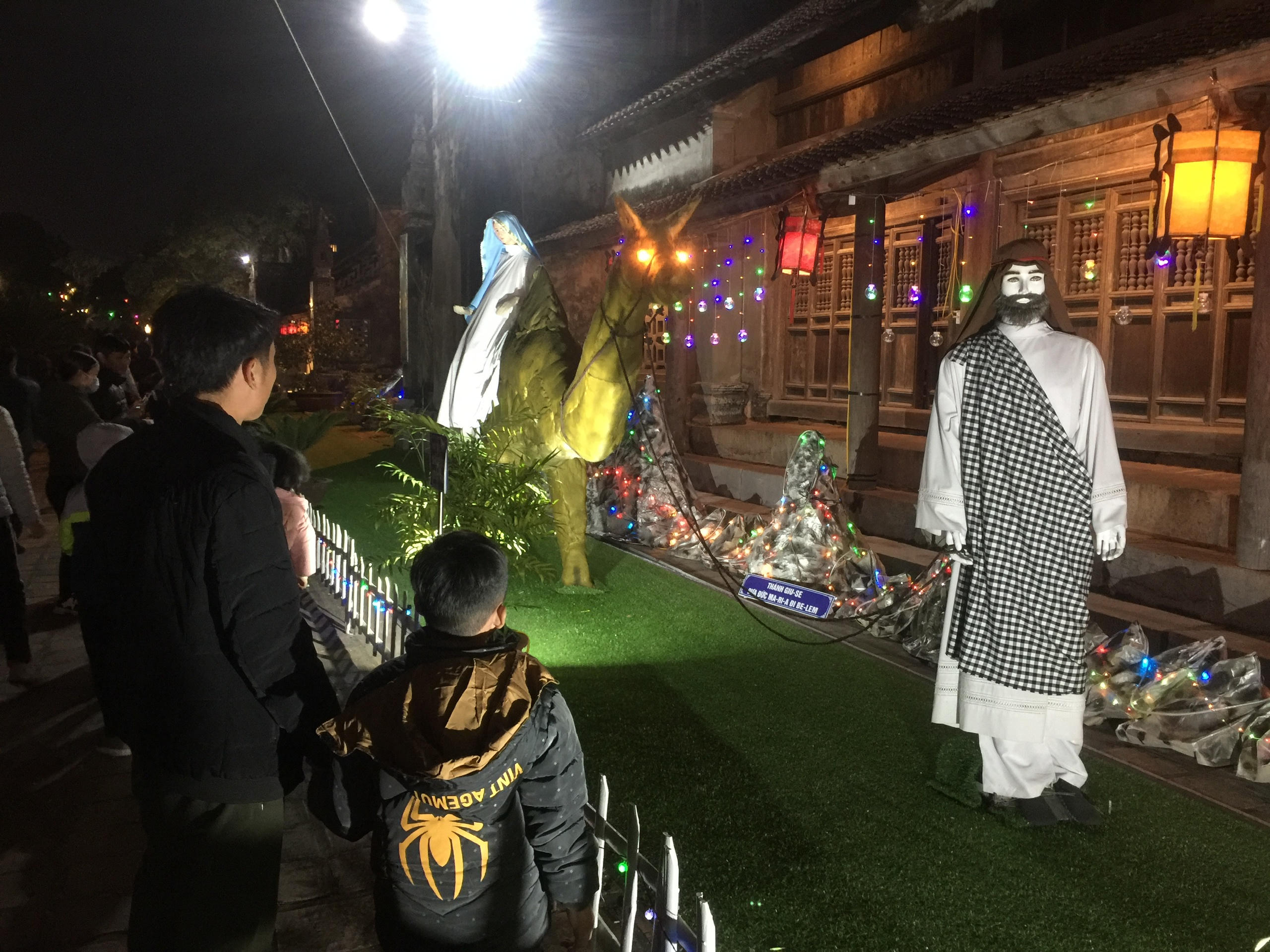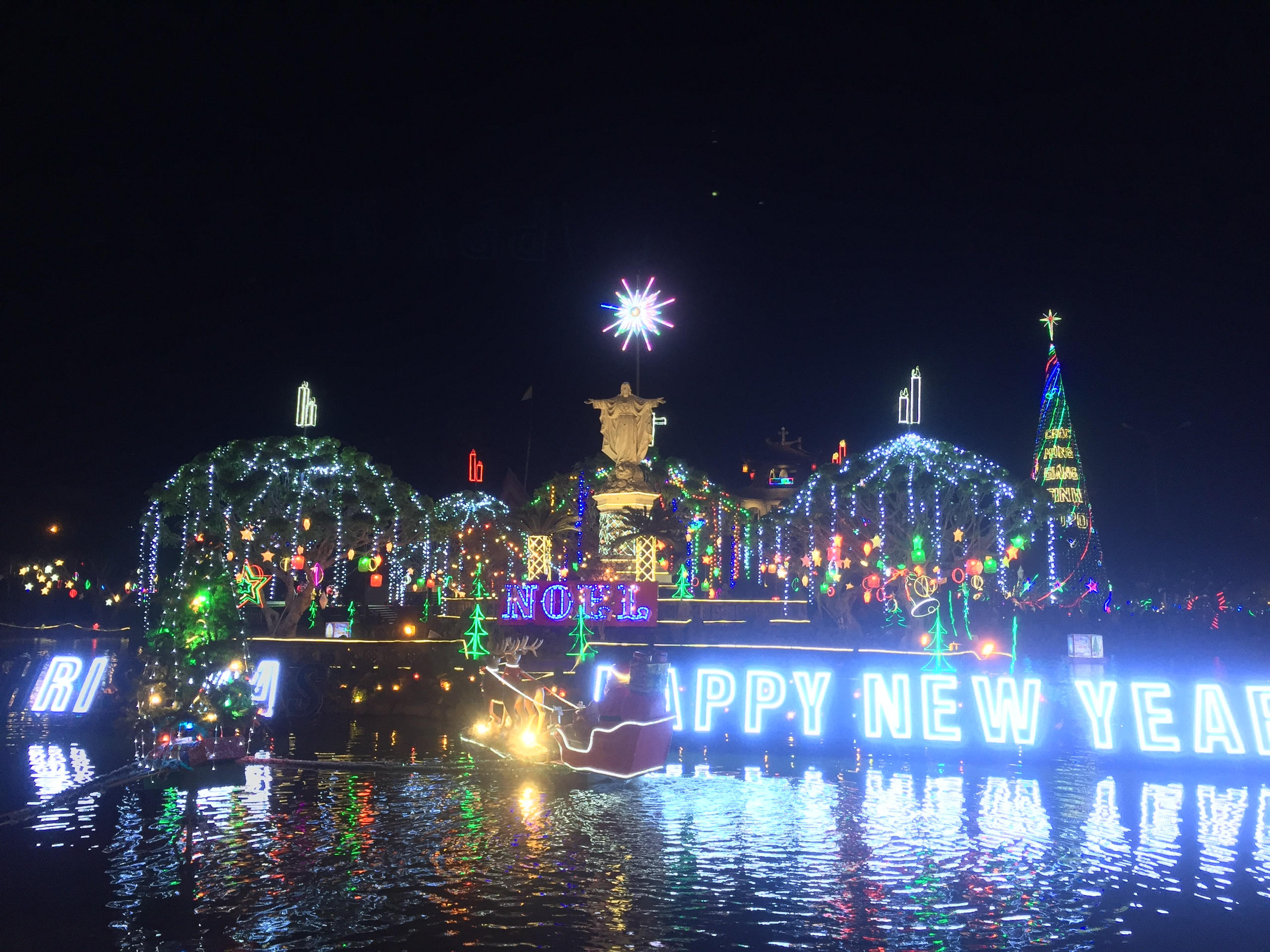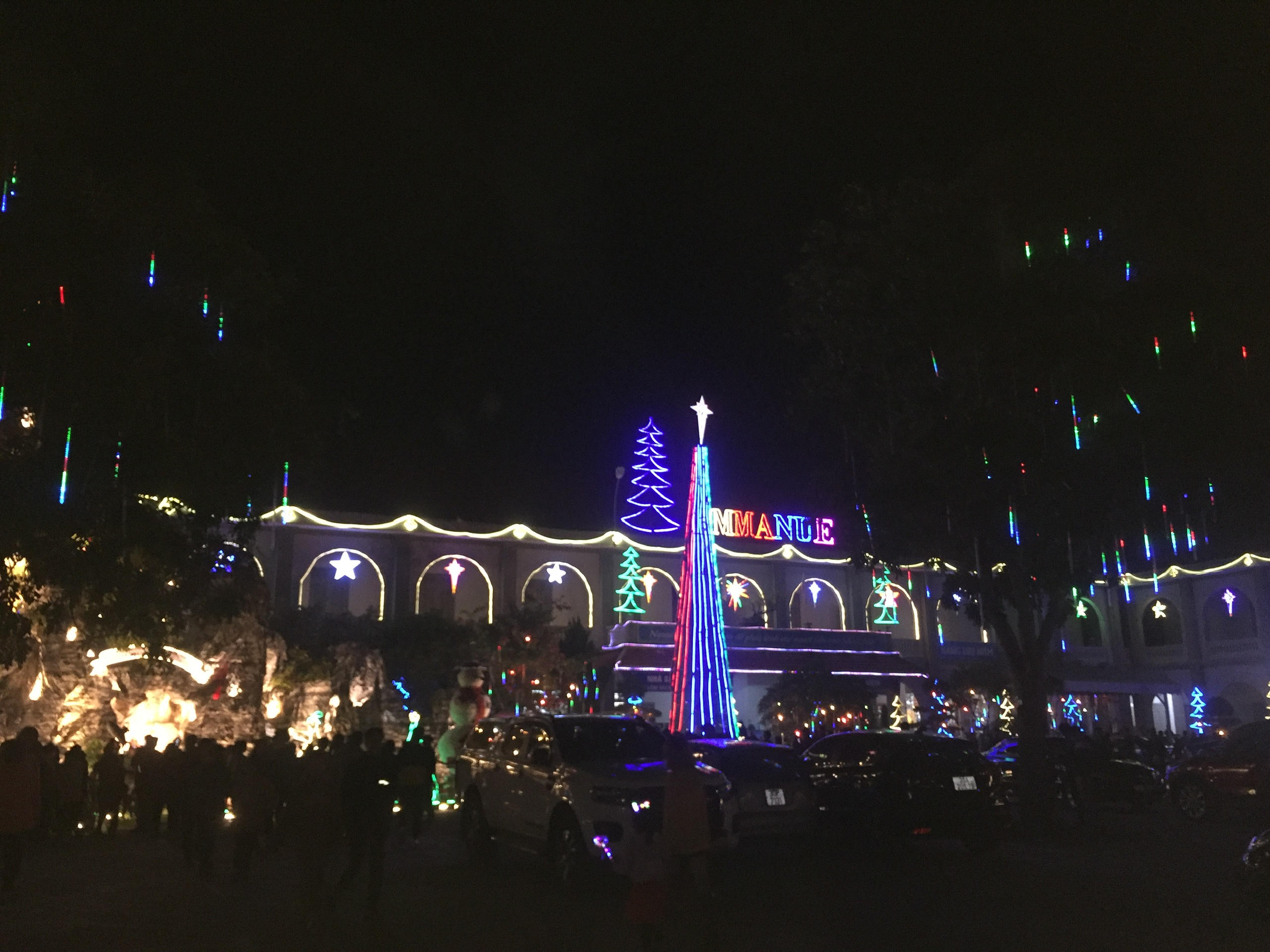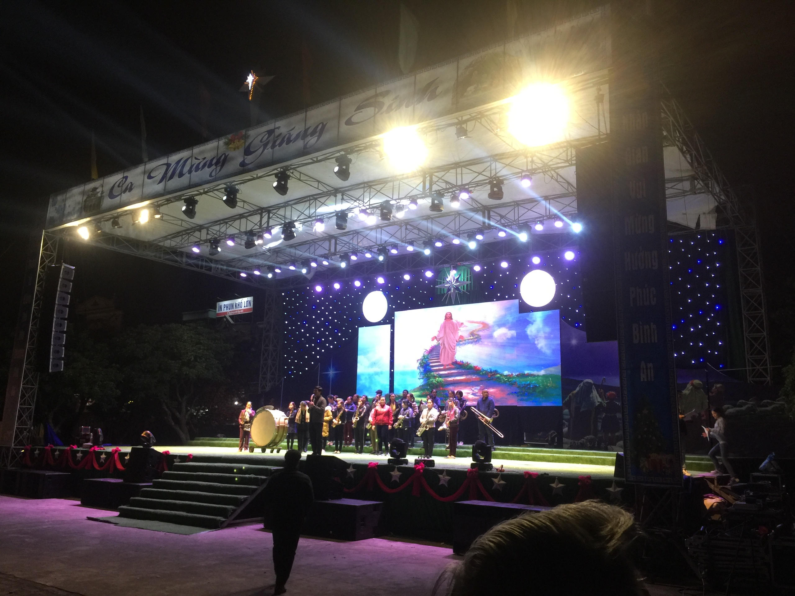 Trong khuôn viên nhà thờ, nổi bật lên là một sân khấu rộng hơn 100m2 - nơi diễn ra các tiết mục văn nghệ chào mừng đêm Giáng sinh.