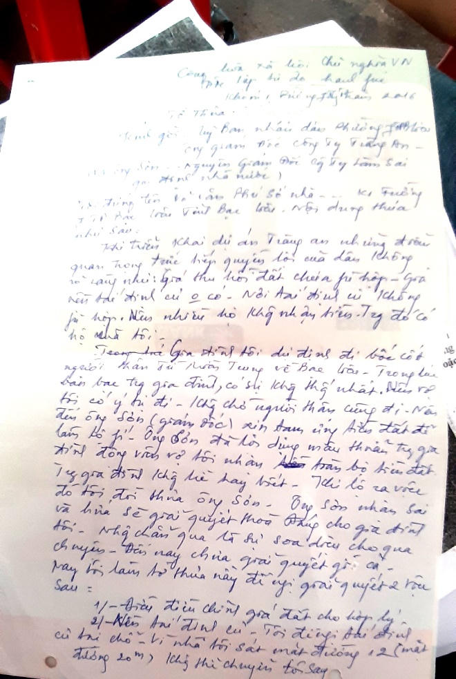 “Tui yêu cầu, khiếu nại 10 năm nay họ vẫn không giải quyết. Theo Quyết định 1411 thì tui phải được quy đổi 12.000 m2 này thành ít nhất 960 m2 đất ở, nhưng đâu thấy. Có lần Phó Chủ tịch UBND TP Bạc Liêu mời tui làm việc. Tui yêu cầu 9 đứa con phải cấp không thu tiền 9 cái nền như đã cam kết. Vị này nói “9 cái thì hơi nhiều nhưng 6 – 7 cái thì được”. Nhưng nói vậy thôi chứ không có văn bản gì, không thực hiện gì”, ông Hớn kể.